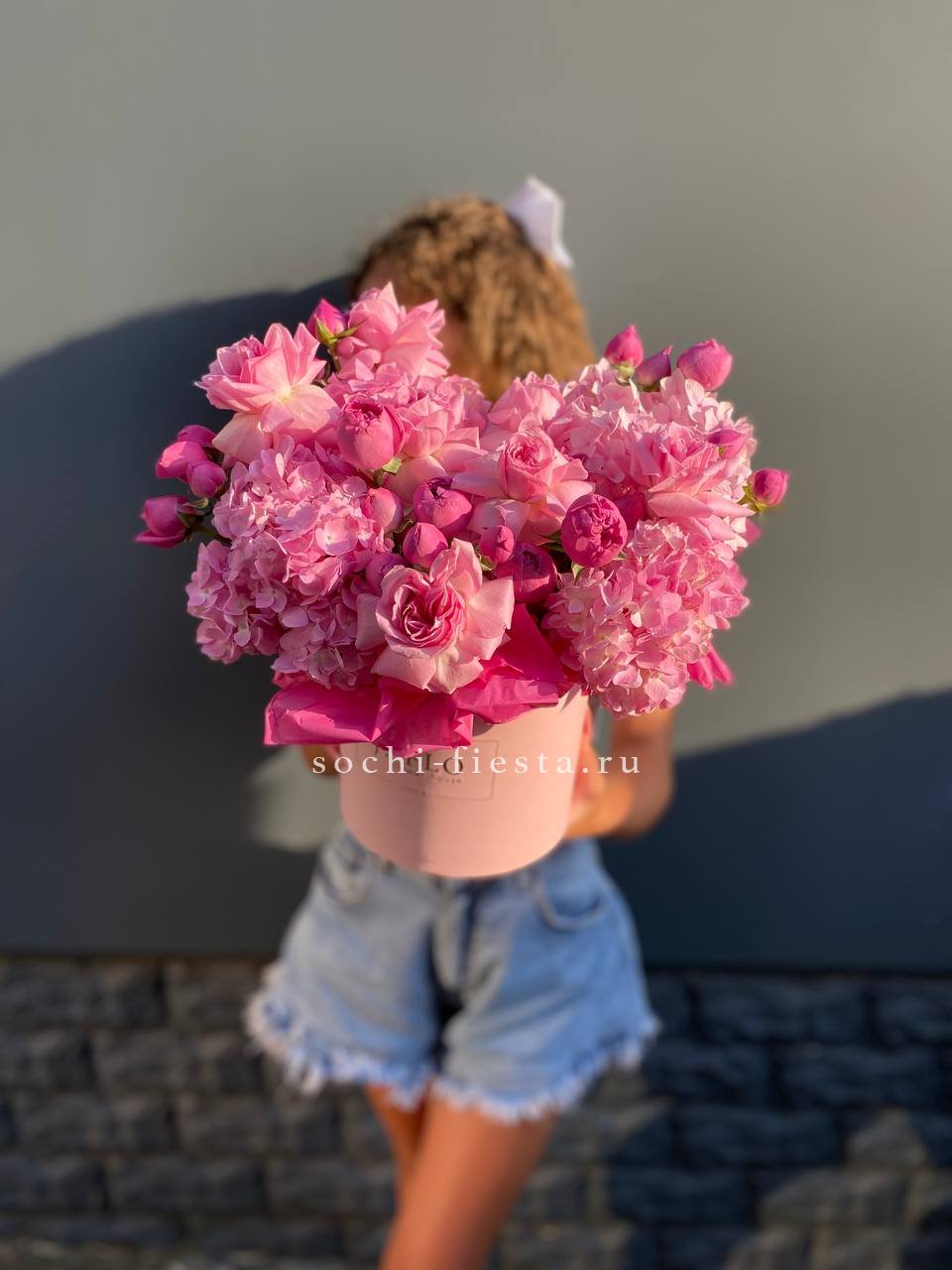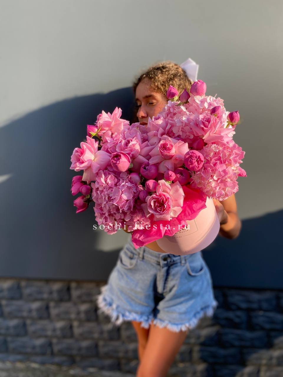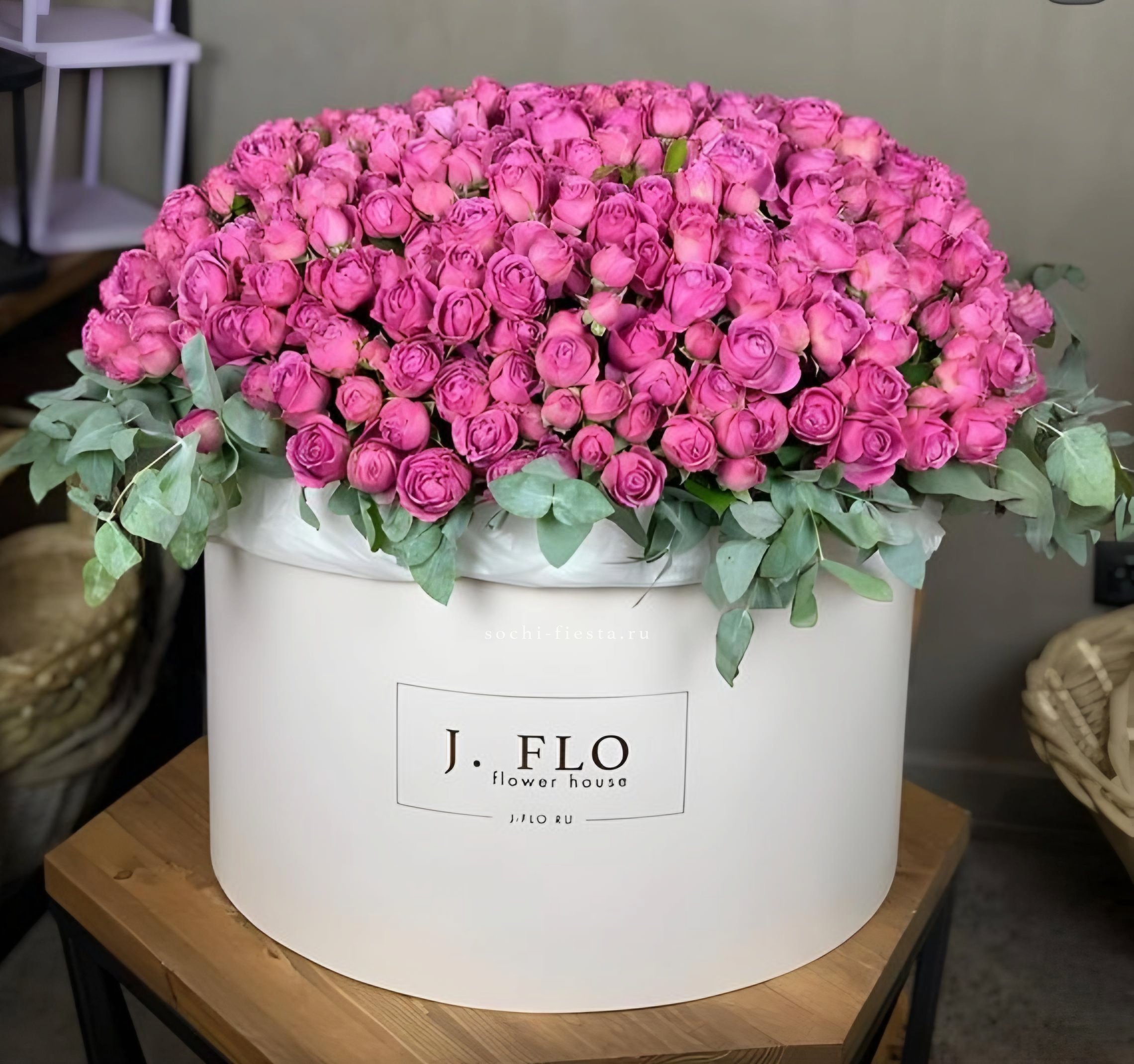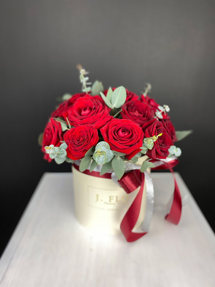 Пионовидные кустовые розы формируют плотный купол с мягкими переходами оттенков. Каждый бутон раскрывается слоями, создавая объёмную текстуру. Эвкалипт добавляет свежести композиции в цилиндре.