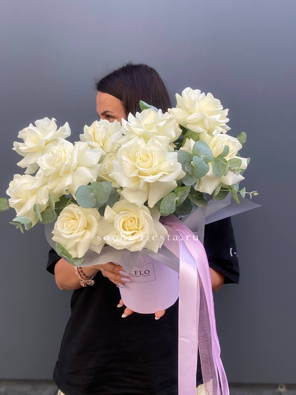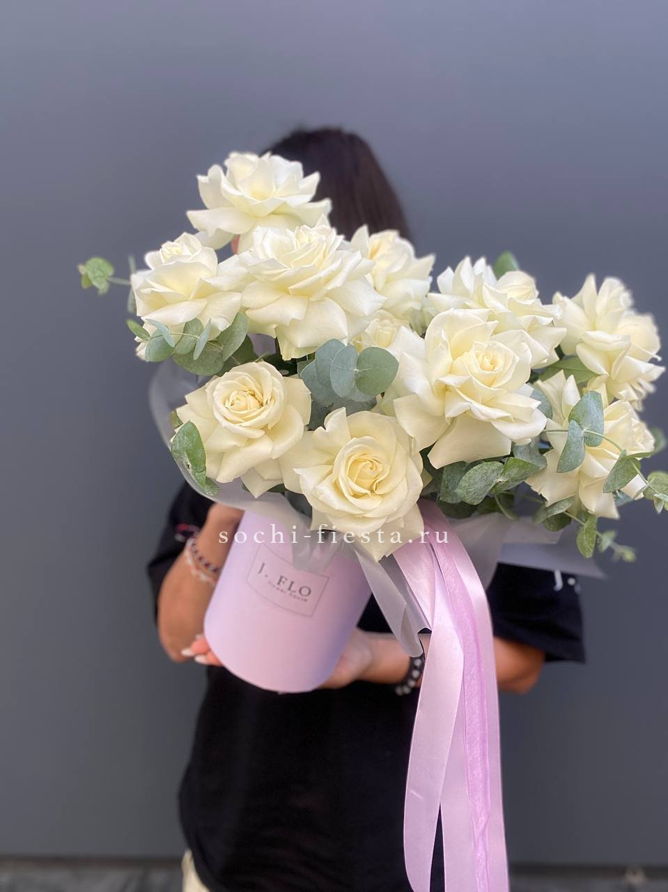 бокс, белая роза, розовая роза, эустома, гортензия, оазис.