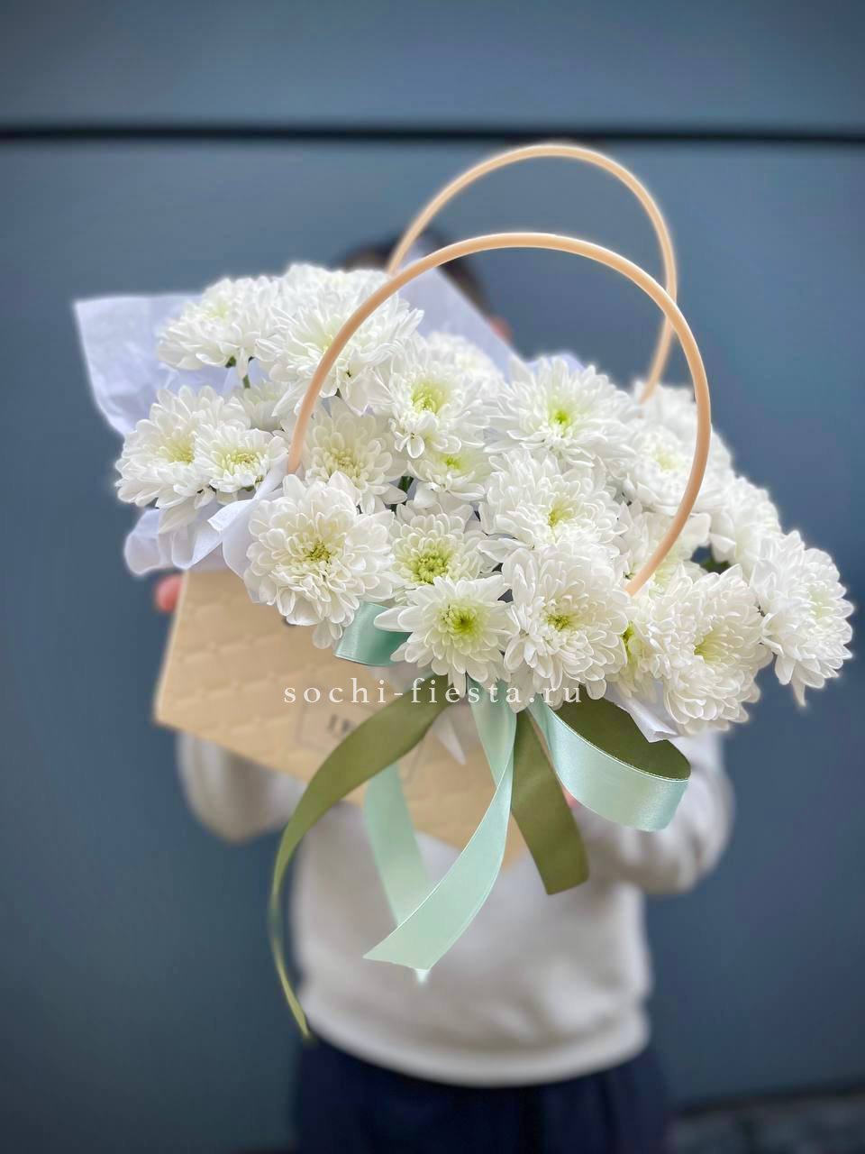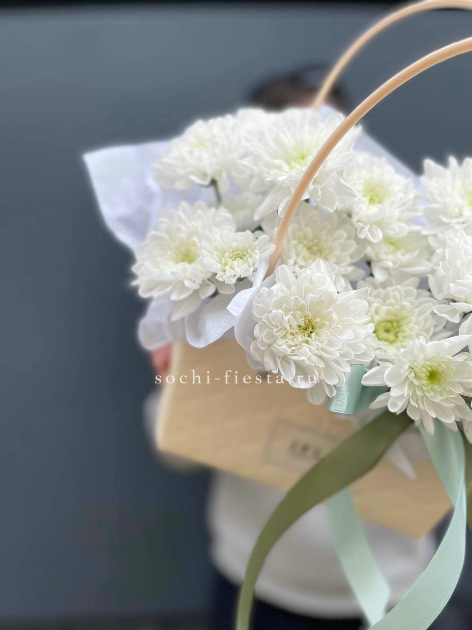 Голубая хризантема в компании воздушного лагуруса напоминает о прохладе летнего утра. Компактная форма в сумочке позволяет разместить цветы на столе или полке без лишних усилий.