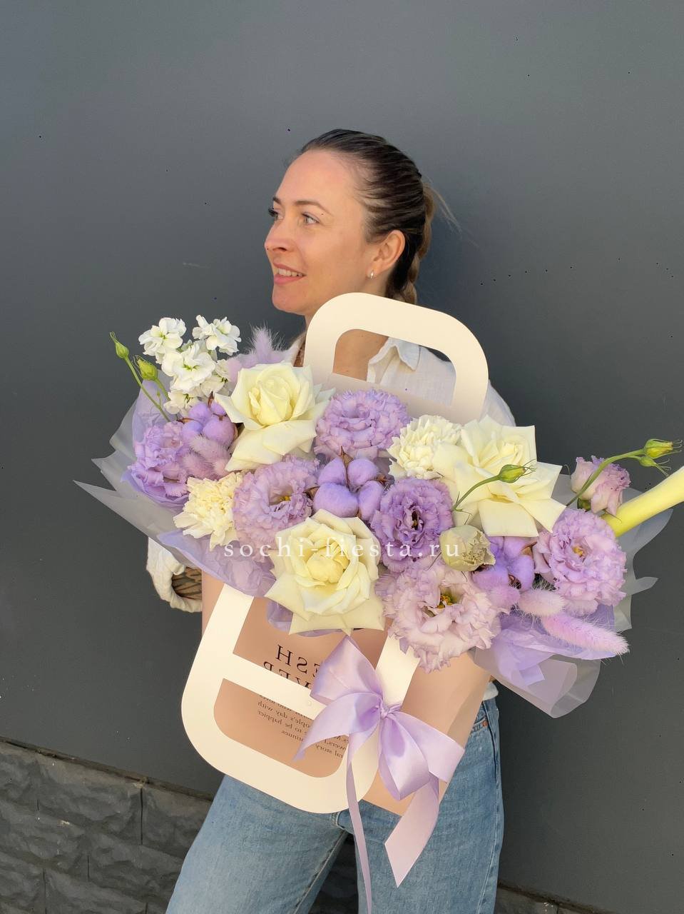 эустома, маттиола, белые розы, хлопок, лента, сумка-кашпо.