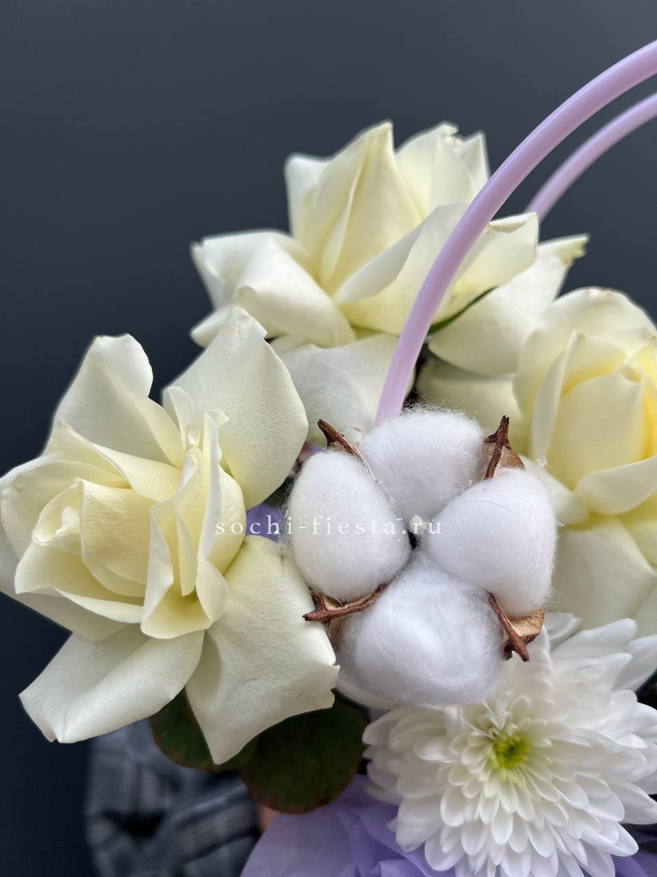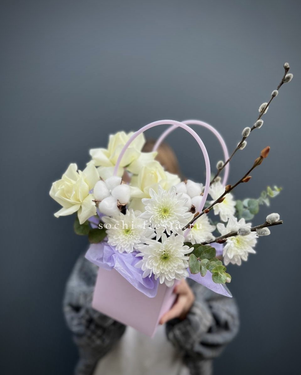 Белоснежные розы переплетаются с воздушной эустомой и раскрытыми лилиями в аккуратной цветочной сумке. Эвкалипт создаёт прохладный фон для светлых бутонов. Композиция на оазисе сохраняет свежесть и форму долгое время.