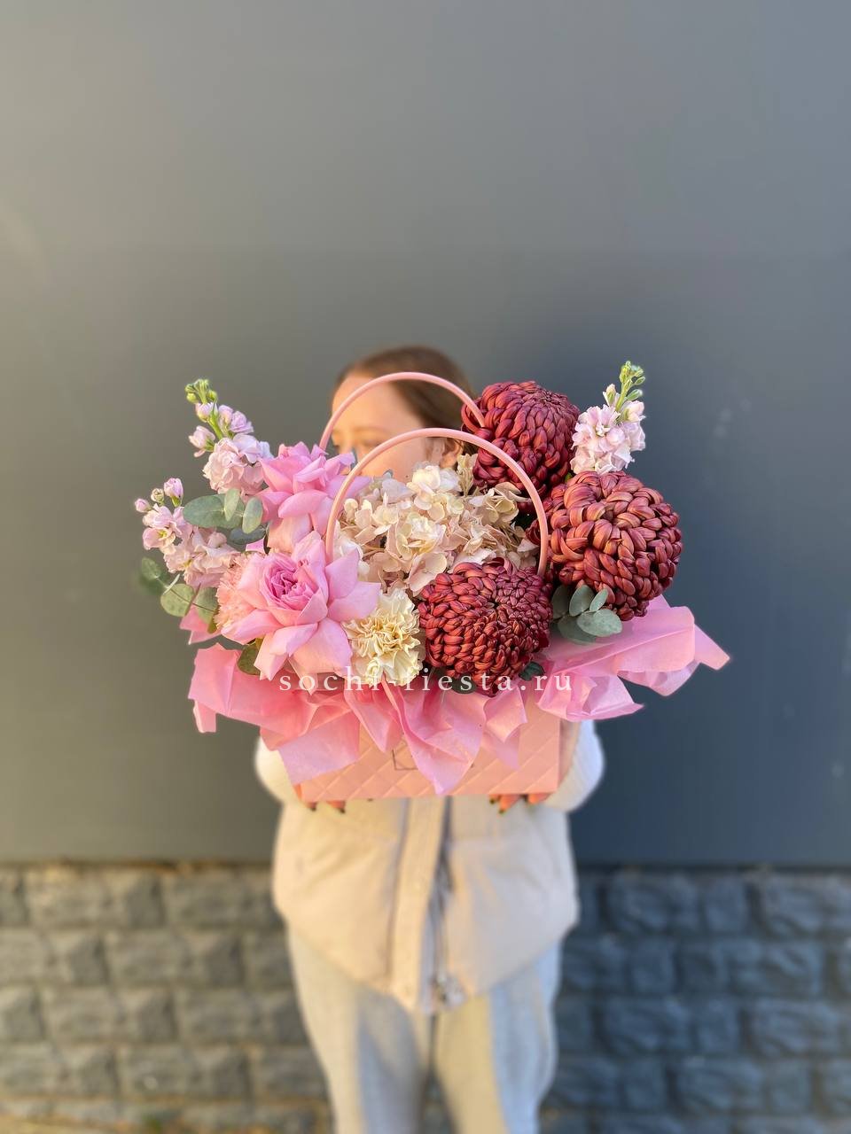бигуди, розовые розы, гортензия, маттиола, эвкалипт, диантусы, сумочка.