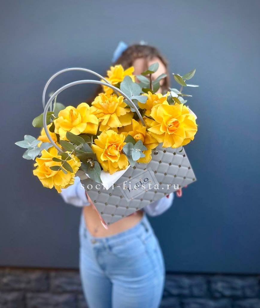 Классическая сумочка с розами в лаконичном исполнении. Эвкалипт обрамляет бутоны серебристой зеленью. Компактная форма подходит для любого интерьера и события.