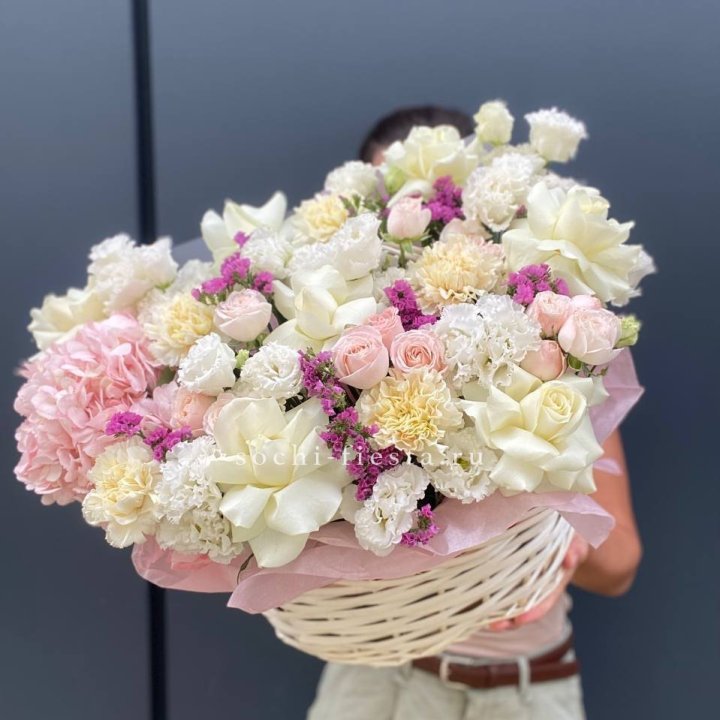 Садовая корзина — главный тренд последних лет. Свободная многовидовая аранжировка в плетёной корзине: эустома, ранункули, нигелла, зелень — ощущение только что срезанных цветов из загородного сада. Покупают те, кто устал от строгих классических форматов и ищет природной органики и лёгкости в подарке.