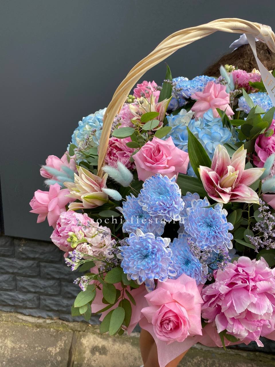 гортензии, лилии, хризантемы, пионы, лимониум, маттиола, корзина.