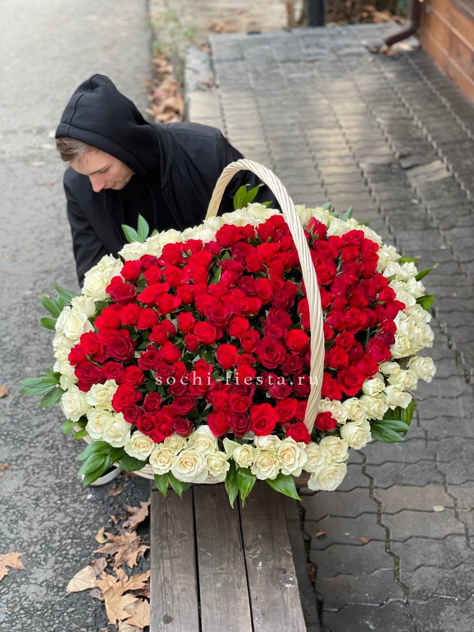 Пятьсот пять алых бутонов собраны в масштабную корзину, которая заполняет пространство цветом и объемом. Это композиция, которая говорит сама за себя своим количеством и насыщенностью.
