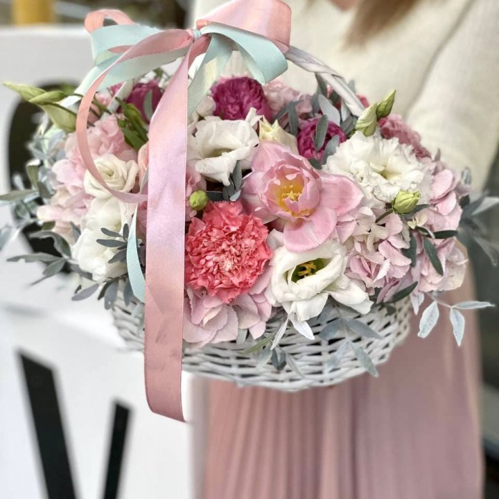 Садовая корзина — главный тренд последних лет. Свободная многовидовая аранжировка в плетёной корзине: эустома, ранункули, нигелла, зелень — ощущение только что срезанных цветов из загородного сада. Покупают те, кто устал от строгих классических форматов и ищет природной органики и лёгкости в подарке.