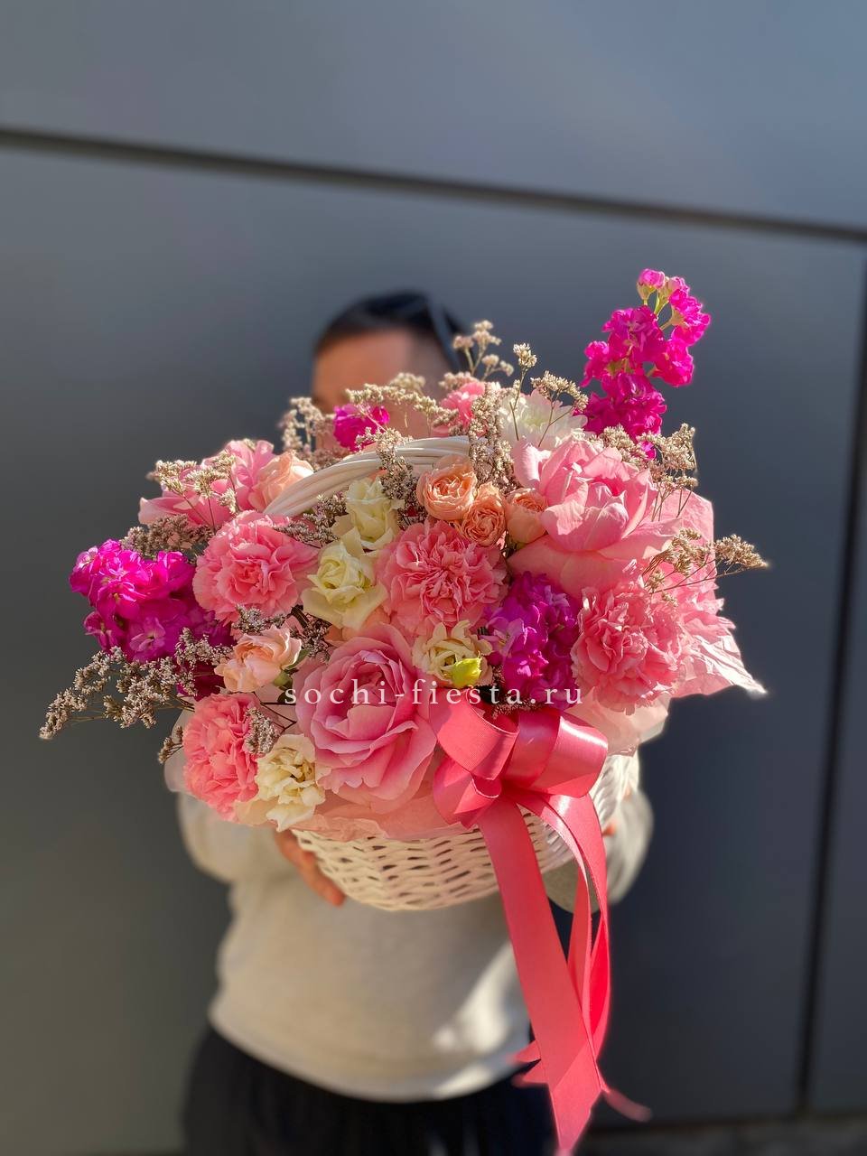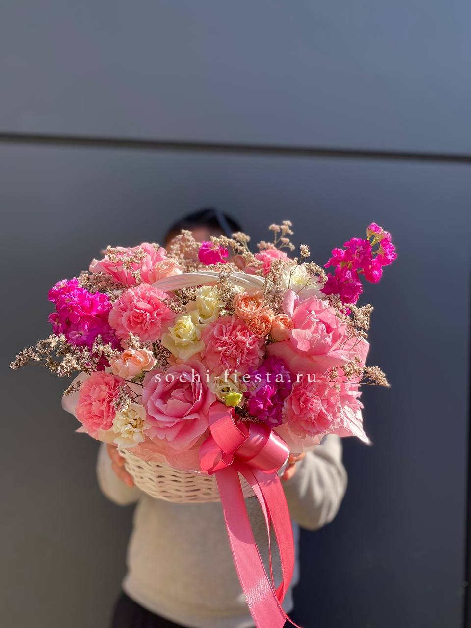 цветочная корзина с розами, мисти баблс, диантусами и гортензией.