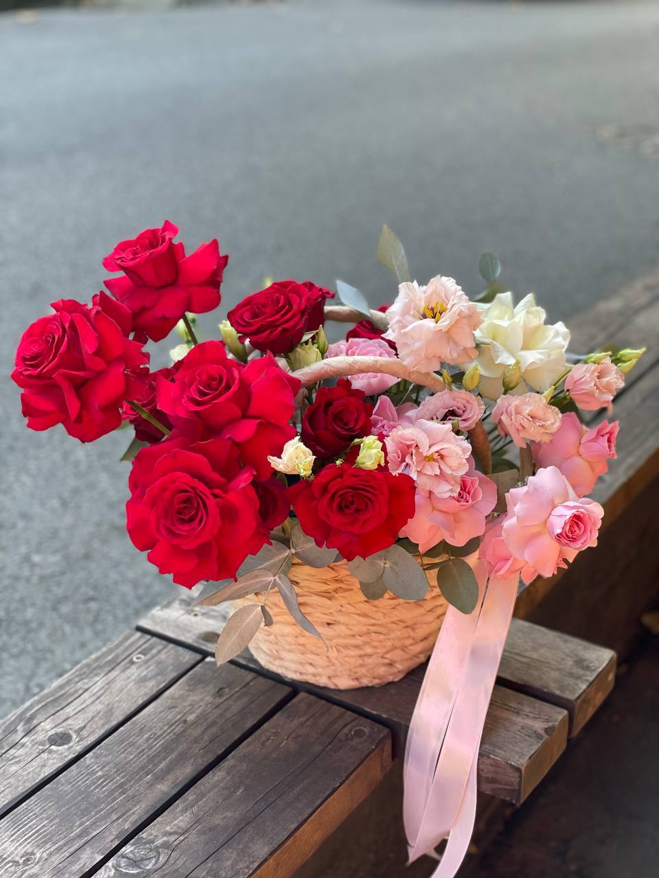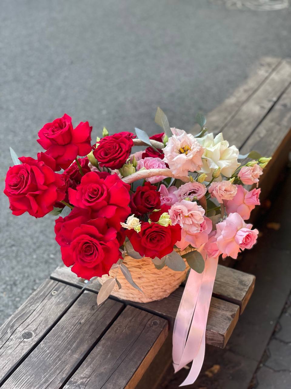 розы кустовые, диантусы, эустома, лента, корзина D35.