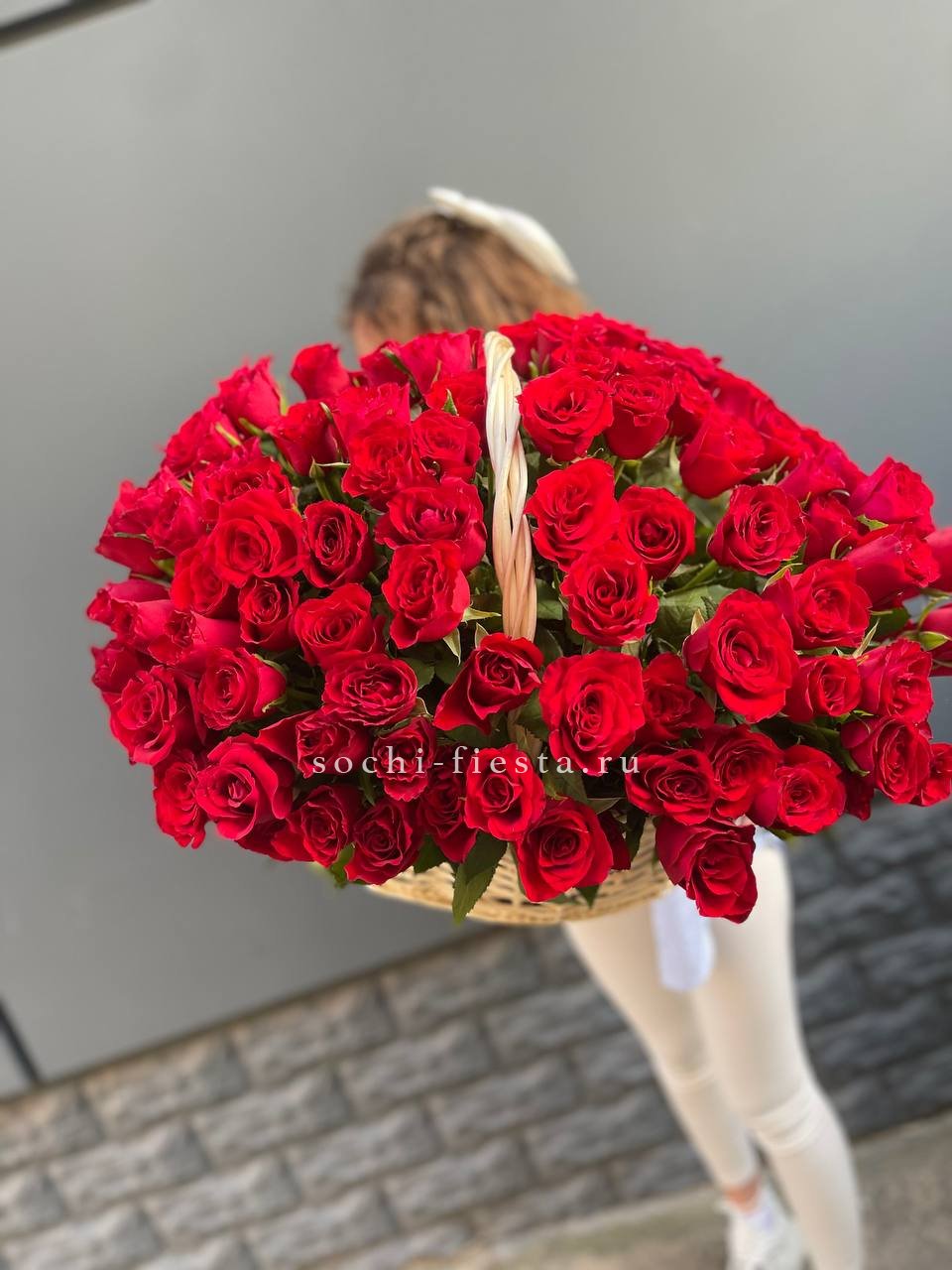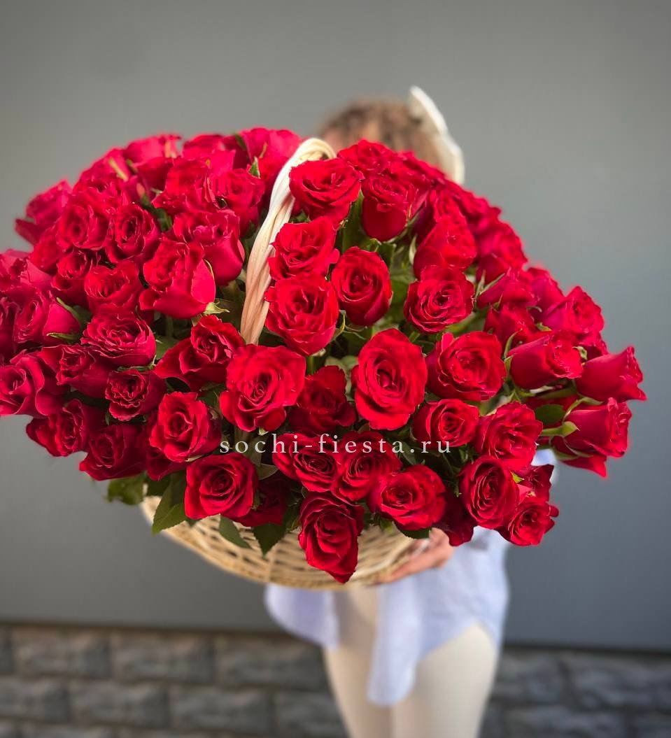 Сорок одна пионовидная роза в светлой корзине выстраивает объёмную композицию с мягкими переливами лилового и розового. Эвкалипт обрамляет густую россыпь бутонов.