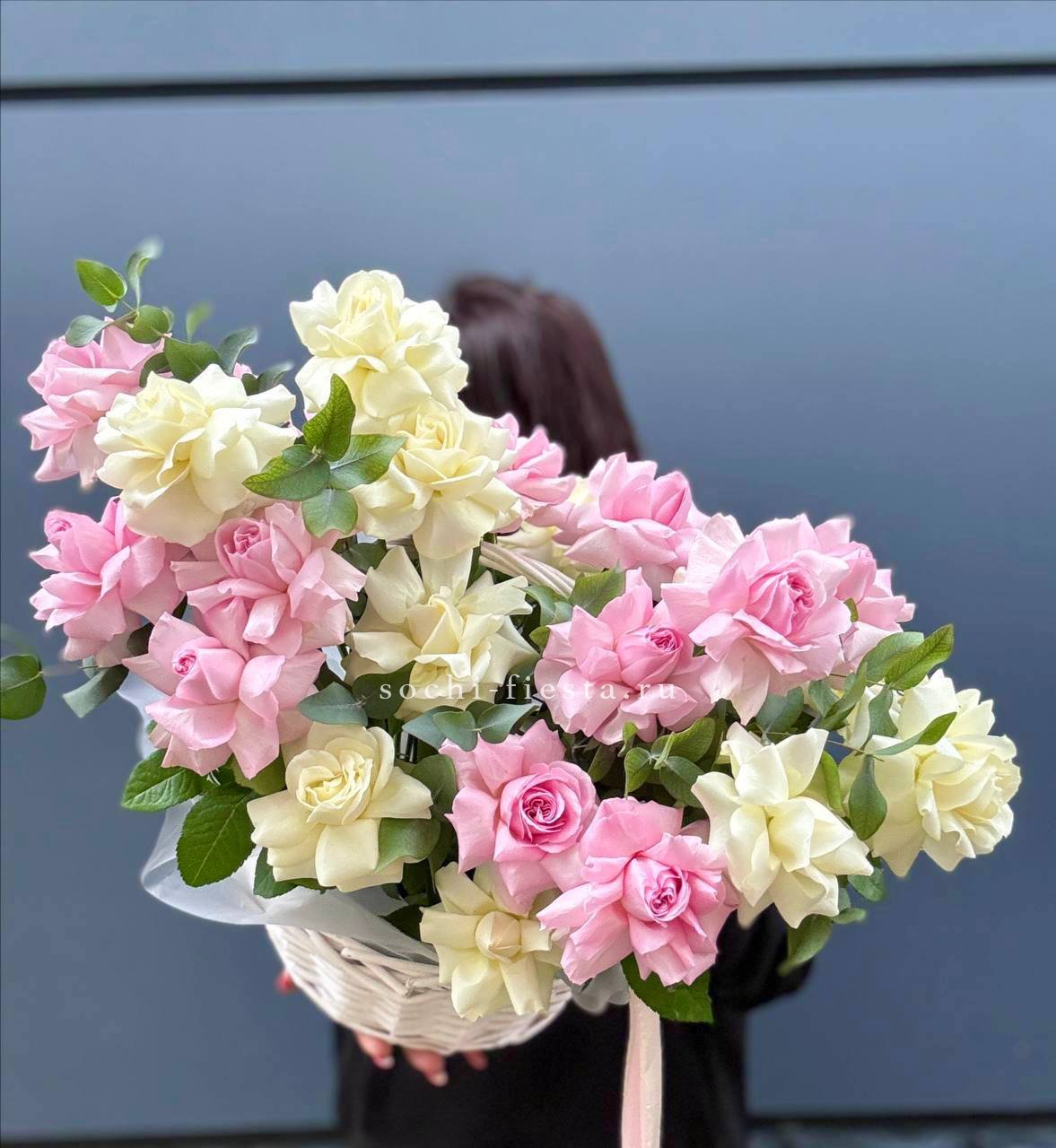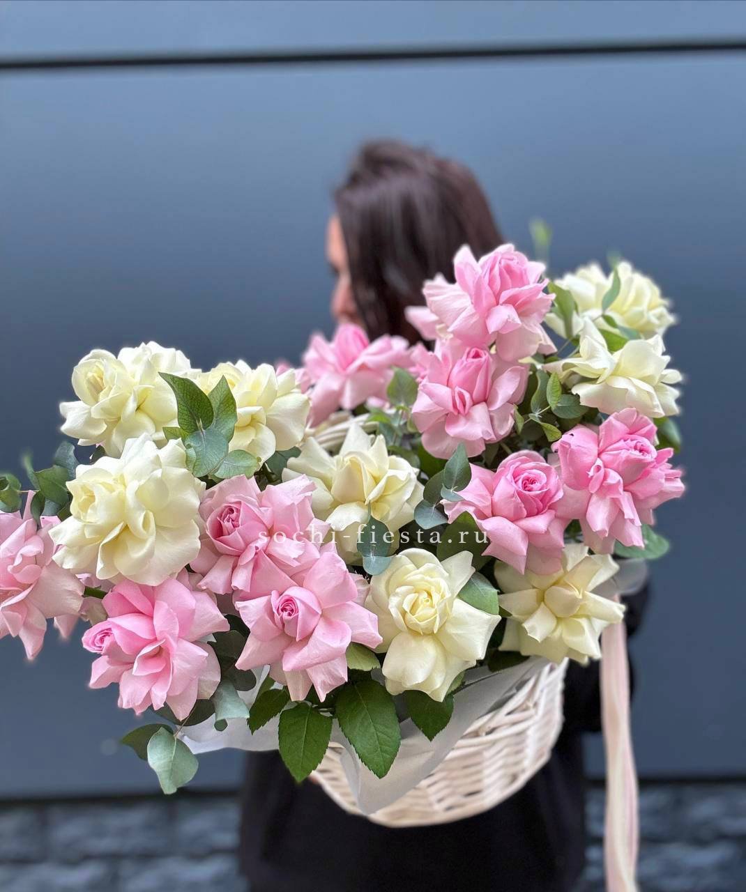 Пышная композиция в плетеной корзине объединяет розы, гортензию, эустому и дельфиниум в единую объемную форму. Маттиола и бомбастик добавляют воздушности, а эвкалипт создает мягкий природный фон. Корзина удобно располагается на любой поверхности и держит форму без дополнительной опоры.
