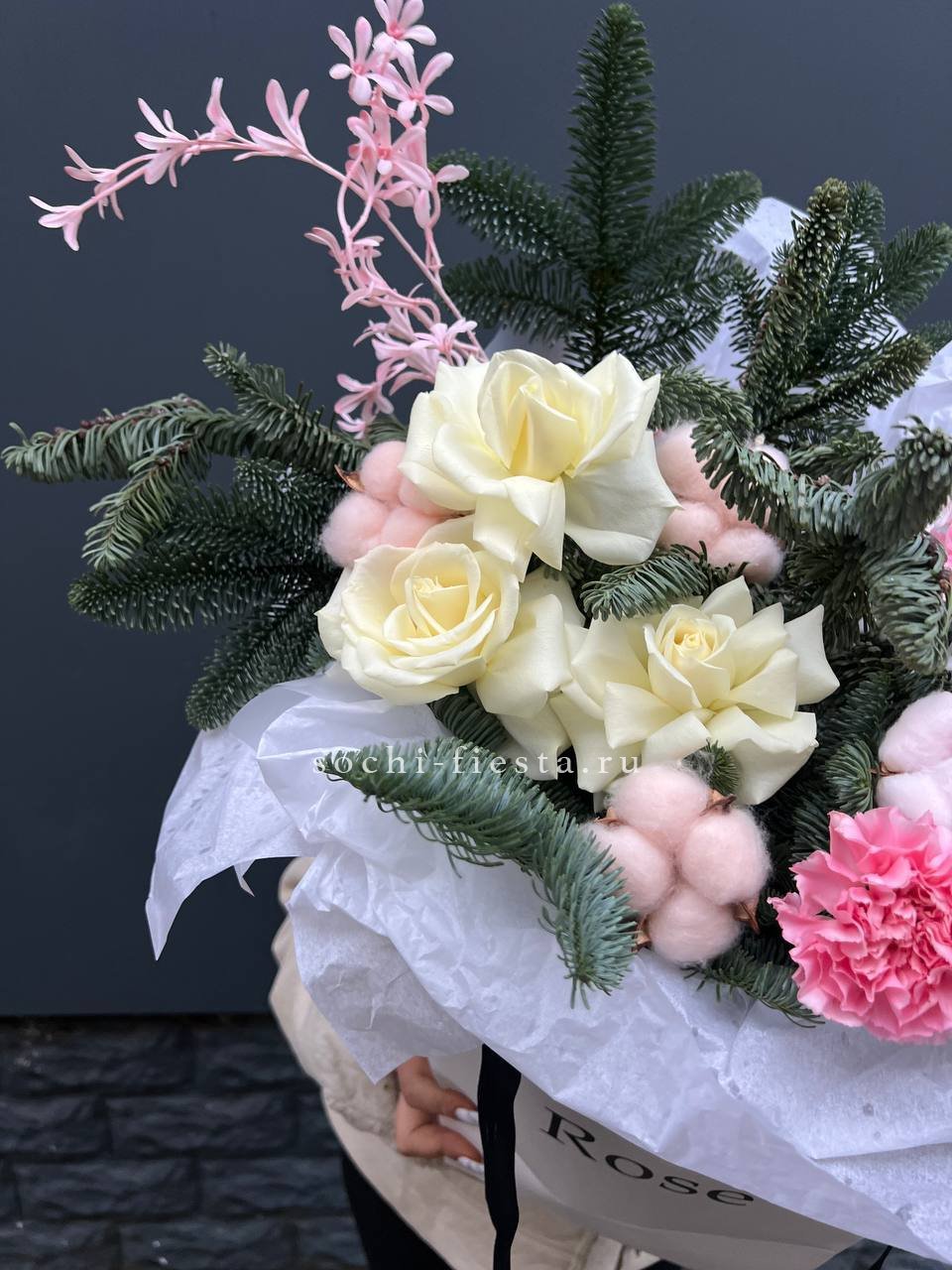 Белые розы и хлопок создают светлую основу, а нобилис вносит графичность. Диантус заполняет пространство мягкими переходами. Композиция выглядит объемно и сбалансировано.
