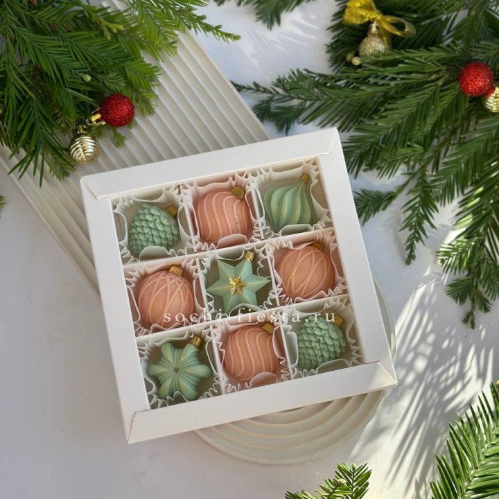 - Новогодняя коробка — ранункулюсы, пихта, декор.