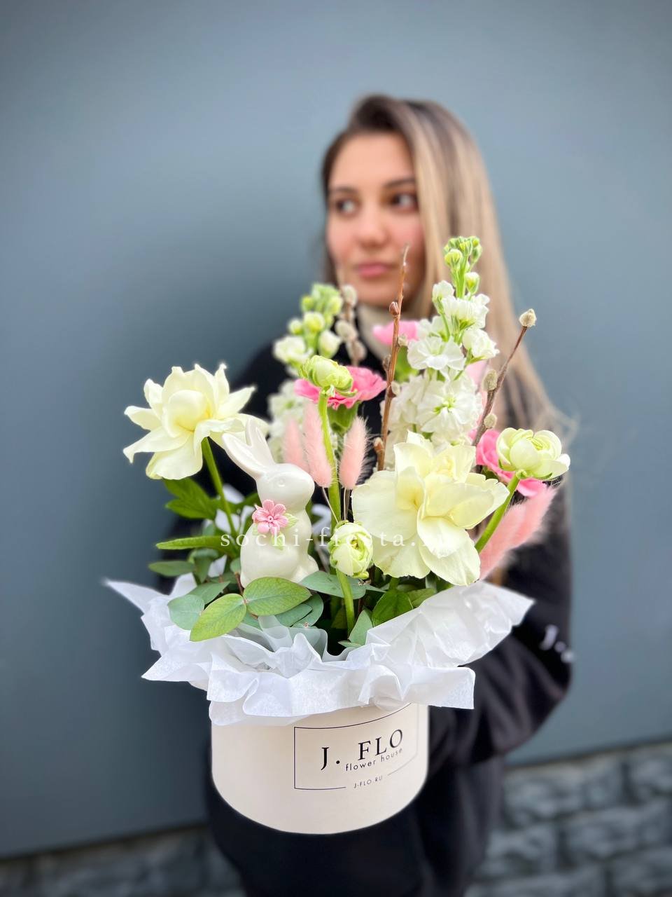Цветочная композиция идеальна для Православных Праздников! Состав выполнен из белых роз, вербы, маттиолы, лагуруса и керамического кролика!