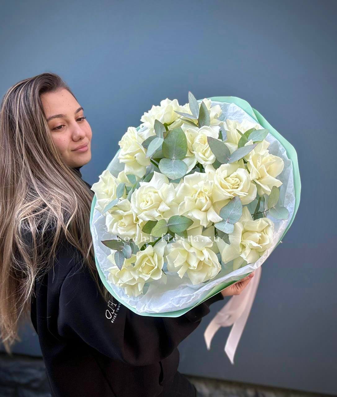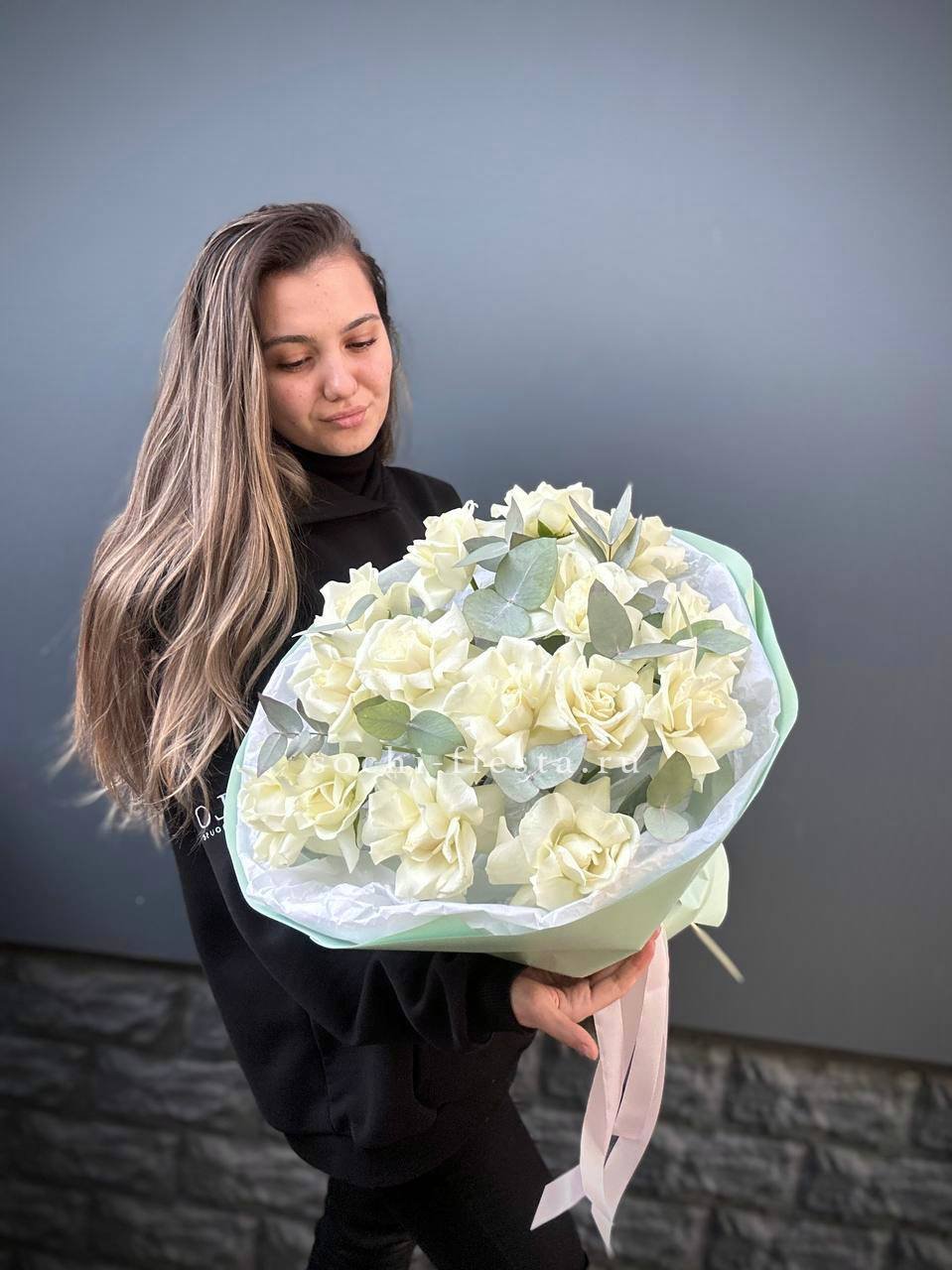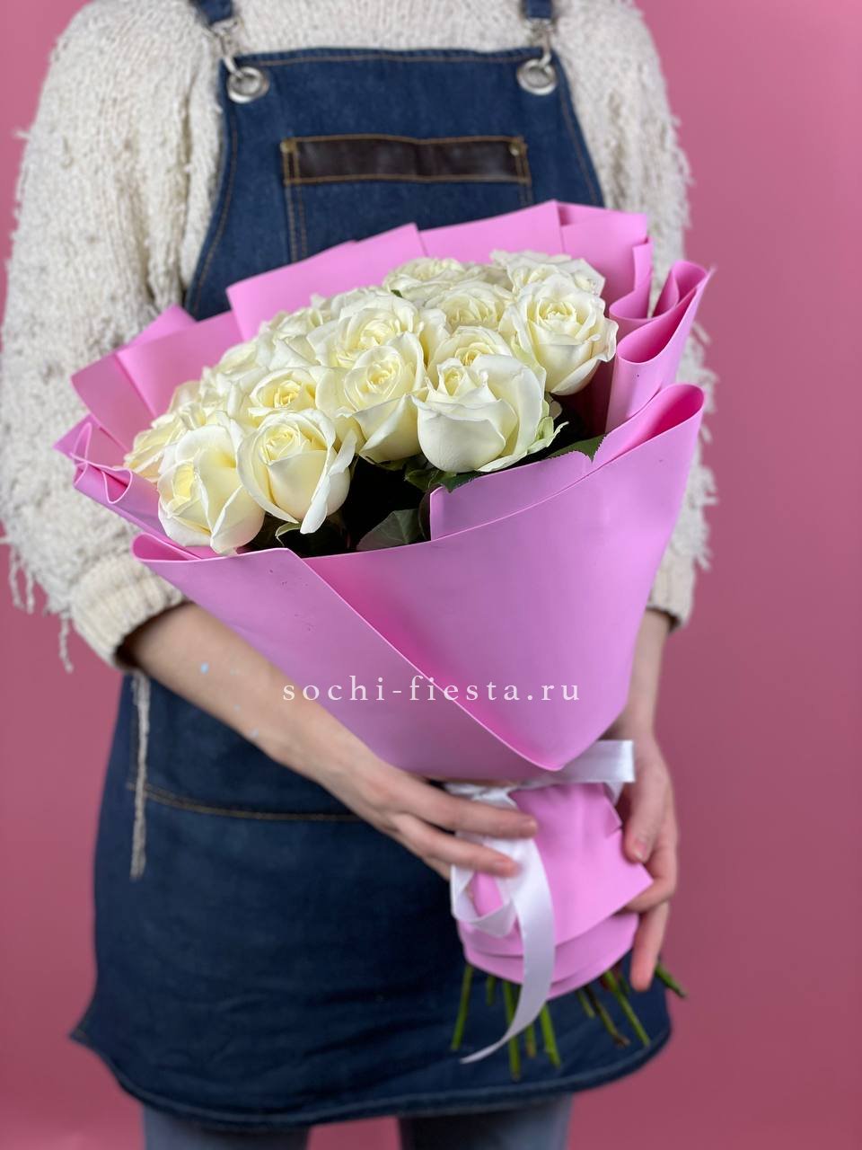 Двадцать пять белых роз образуют объёмную композицию с выразительным силуэтом. Плотная сборка и ритмичное расположение бутонов создают графичное впечатление.