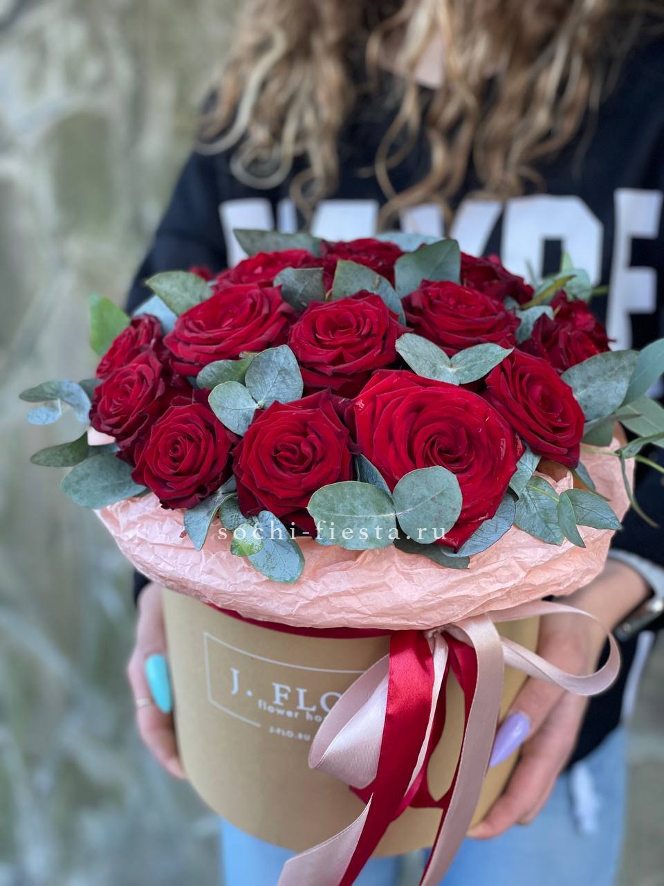 Пять алых бутонов собраны в лаконичную вертикальную форму. Серебристый эвкалипт добавляет воздуха между стеблями. Минималистичная подача для тех, кто ценит сдержанность.