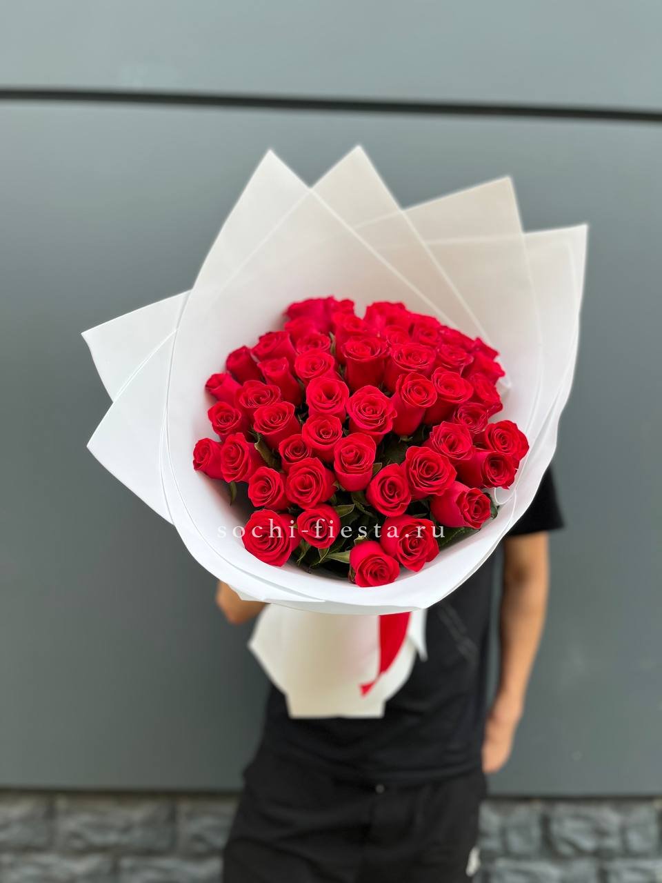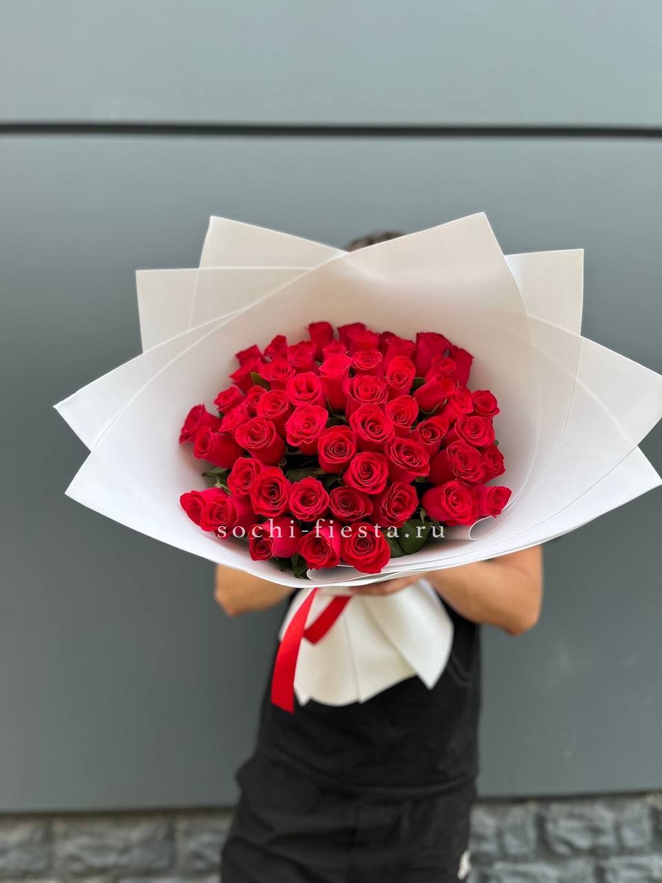 Красный монохром из пятидесяти одной розы притягивает взгляд своей насыщенностью. Крупная композиция заполняет пространство и создает яркое визуальное впечатление.