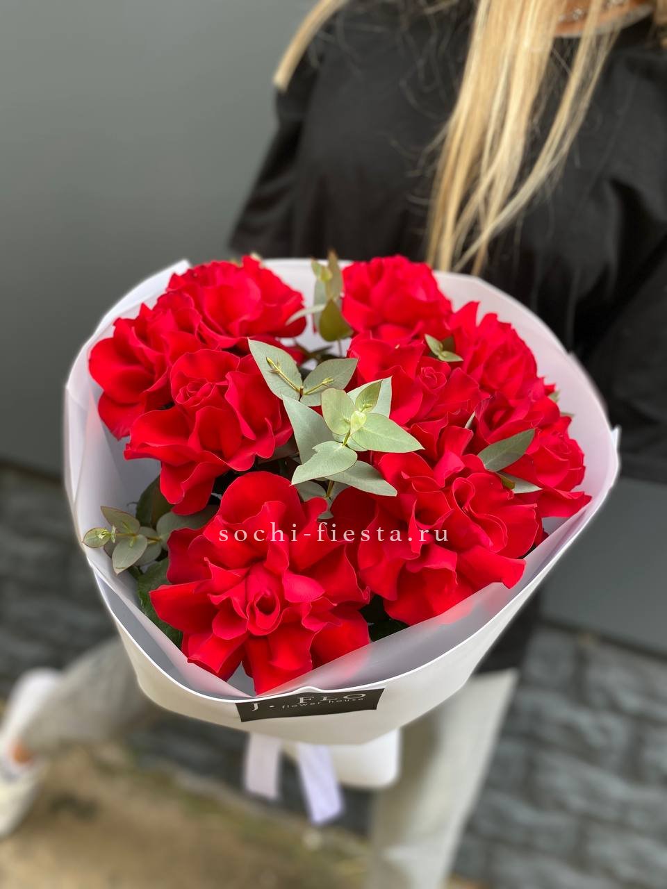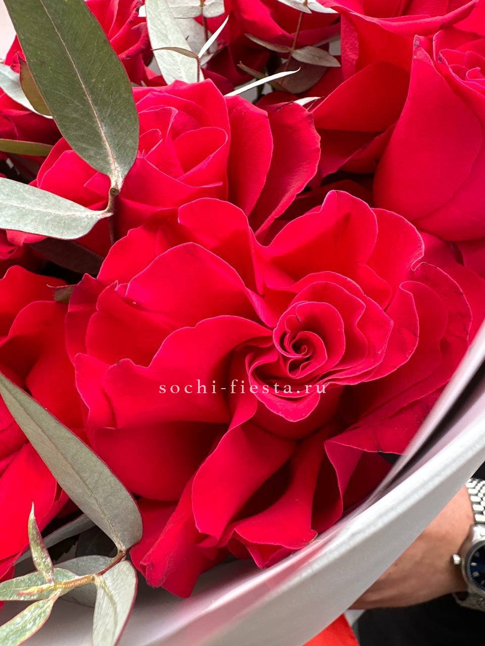 Французские розы с вывернутыми лепестками образуют пышную фактуру и глубину. Эвкалипт оттеняет насыщенность красного и придаёт букету свежесть.