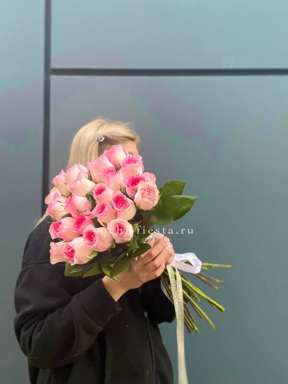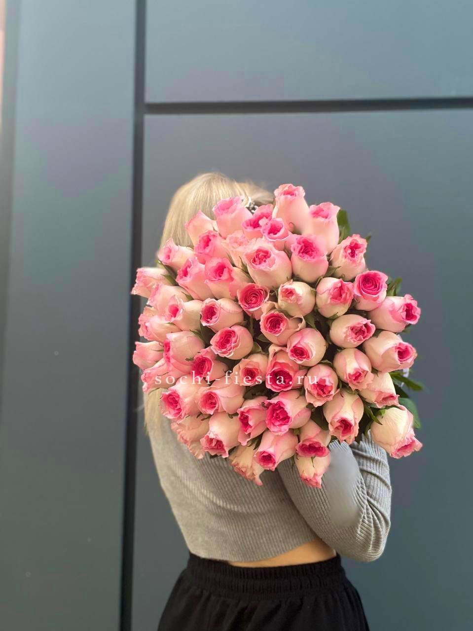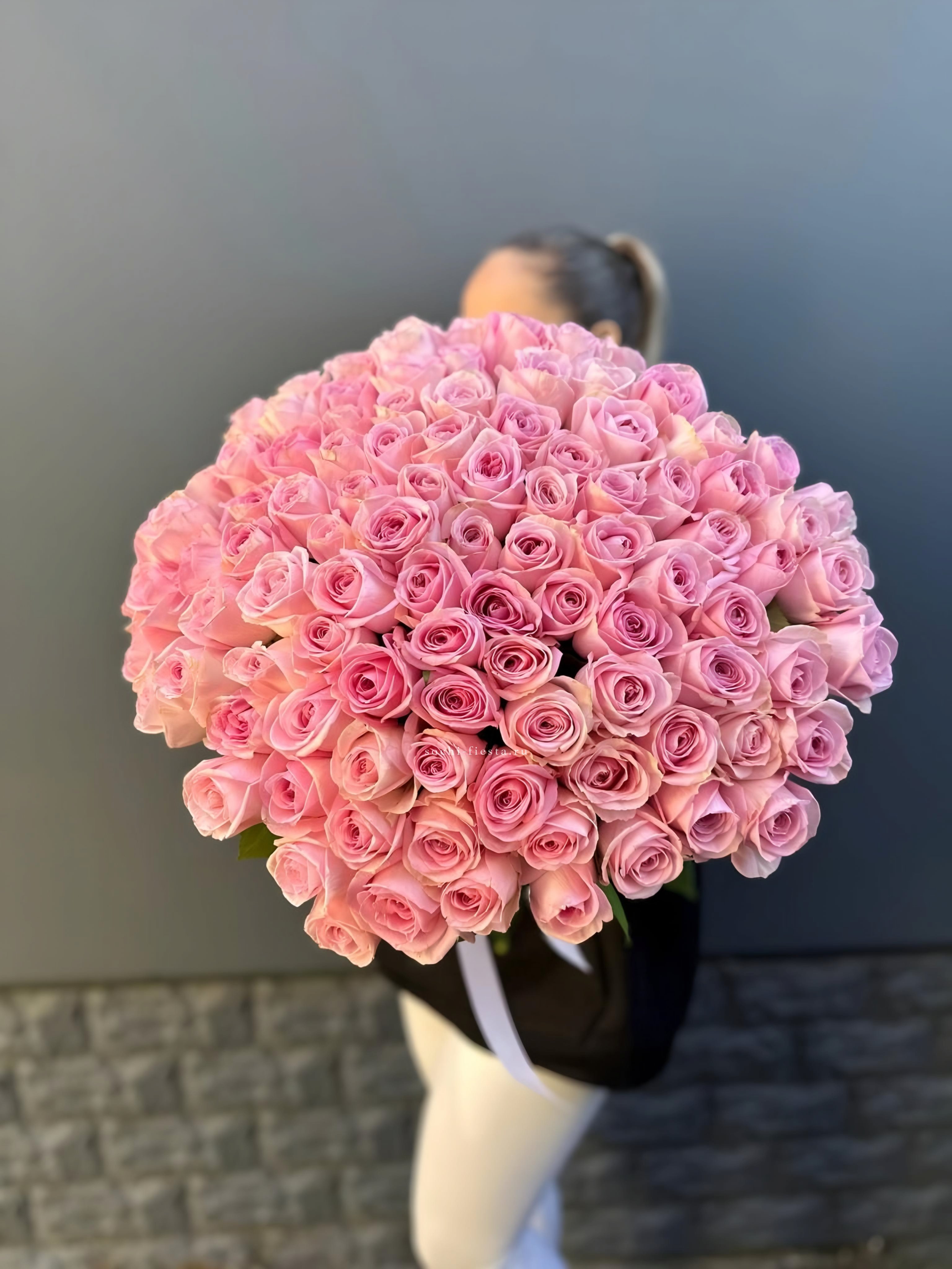 роза розовая - 101 шт., лента, белая дизайнерская бумага.