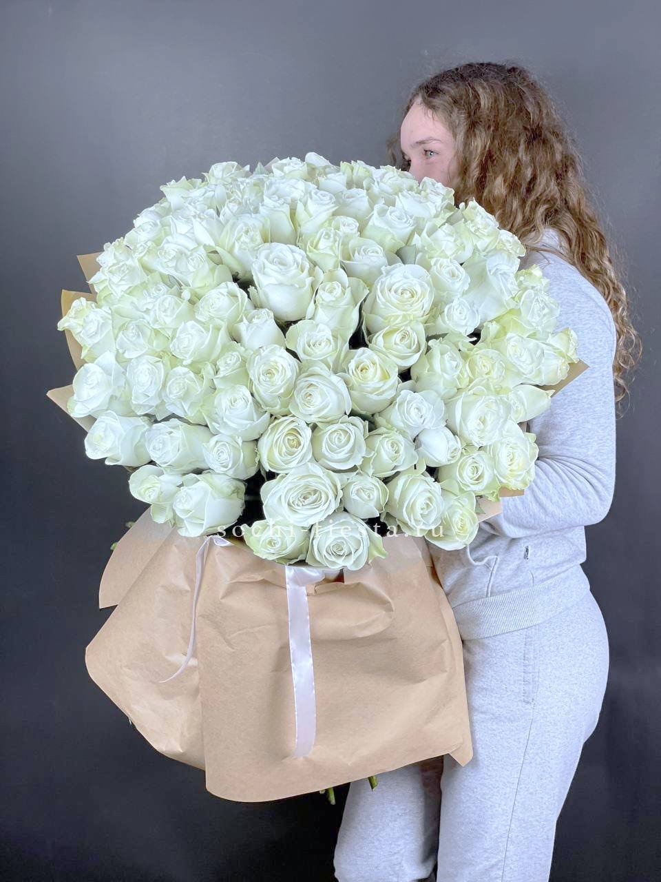 Сто один белый бутон формирует внушительную композицию на длинных стеблях. Это букет для пространств с открытой архитектурой и для моментов когда важен масштаб.
