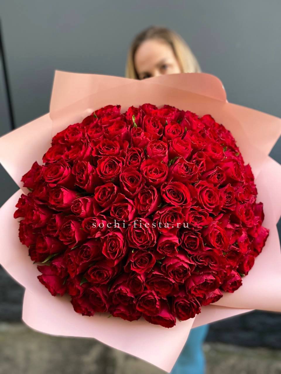 Пятьдесят пять роз собраны в плотную округлую форму с чёткими линиями и уверенным силуэтом. Букет держит структуру и создаёт ощущение завершённости.