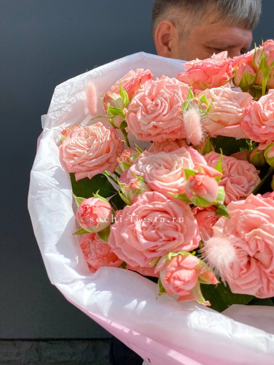Кремовые кустовые розы сорта Мадам Бомбастик с пушистым лагурусом в дизайнерской упаковке. Многослойные бутоны создают воздушный силуэт. Мягкая пастельная гамма и природная фактура трав формируют спокойный образ.