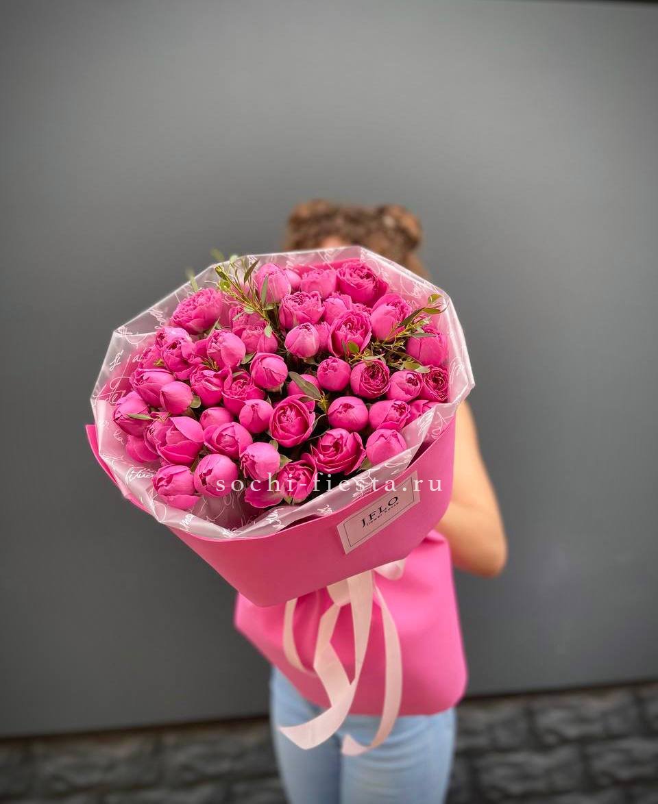 35 пионовидных кустовых роз, лента, дизайнерская пленка.