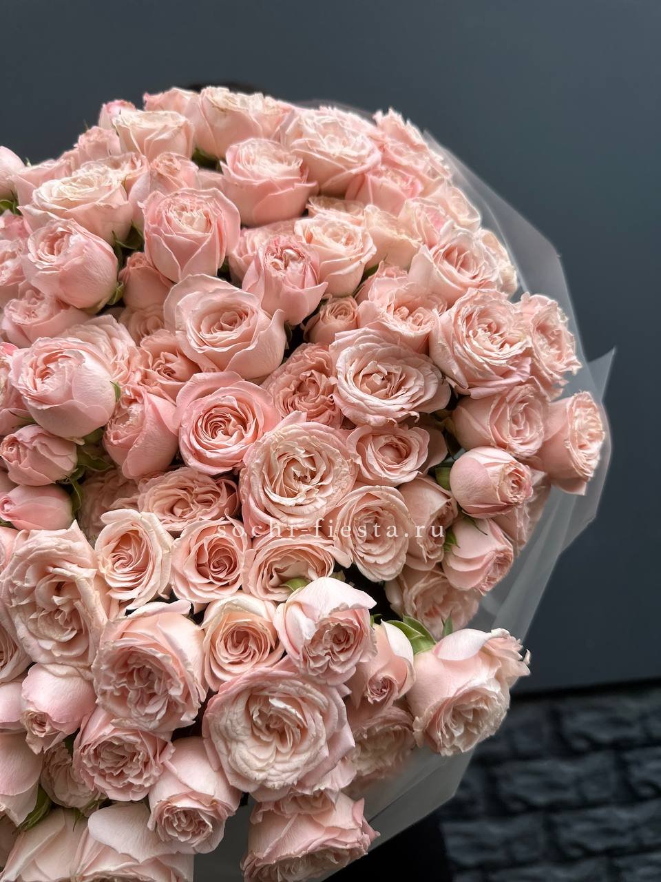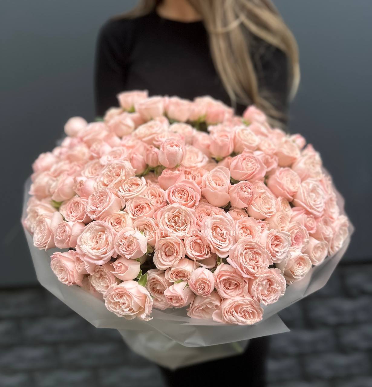 пионовидные розы Бомбастик нежных оттенков, лента, упаковка.
