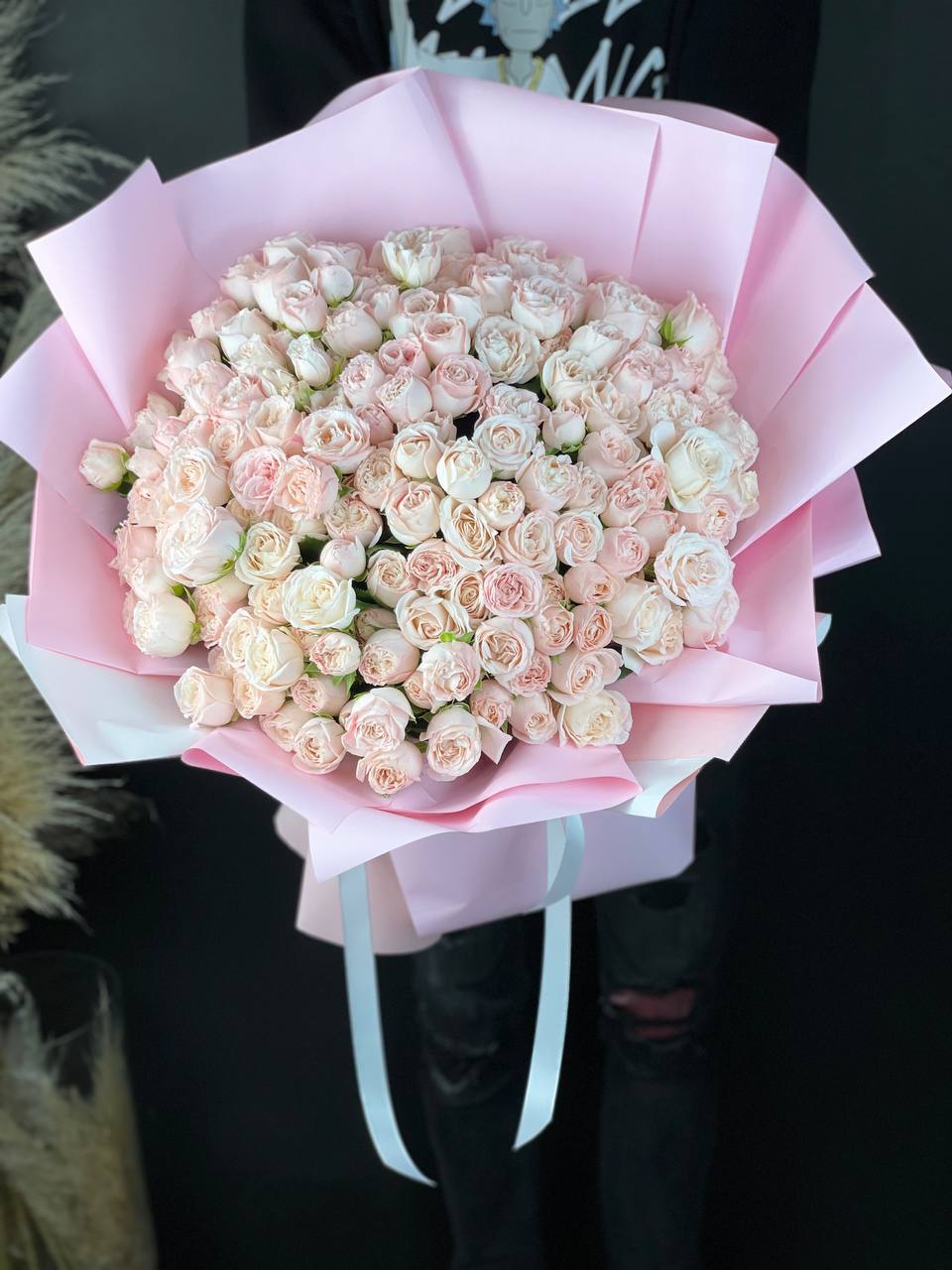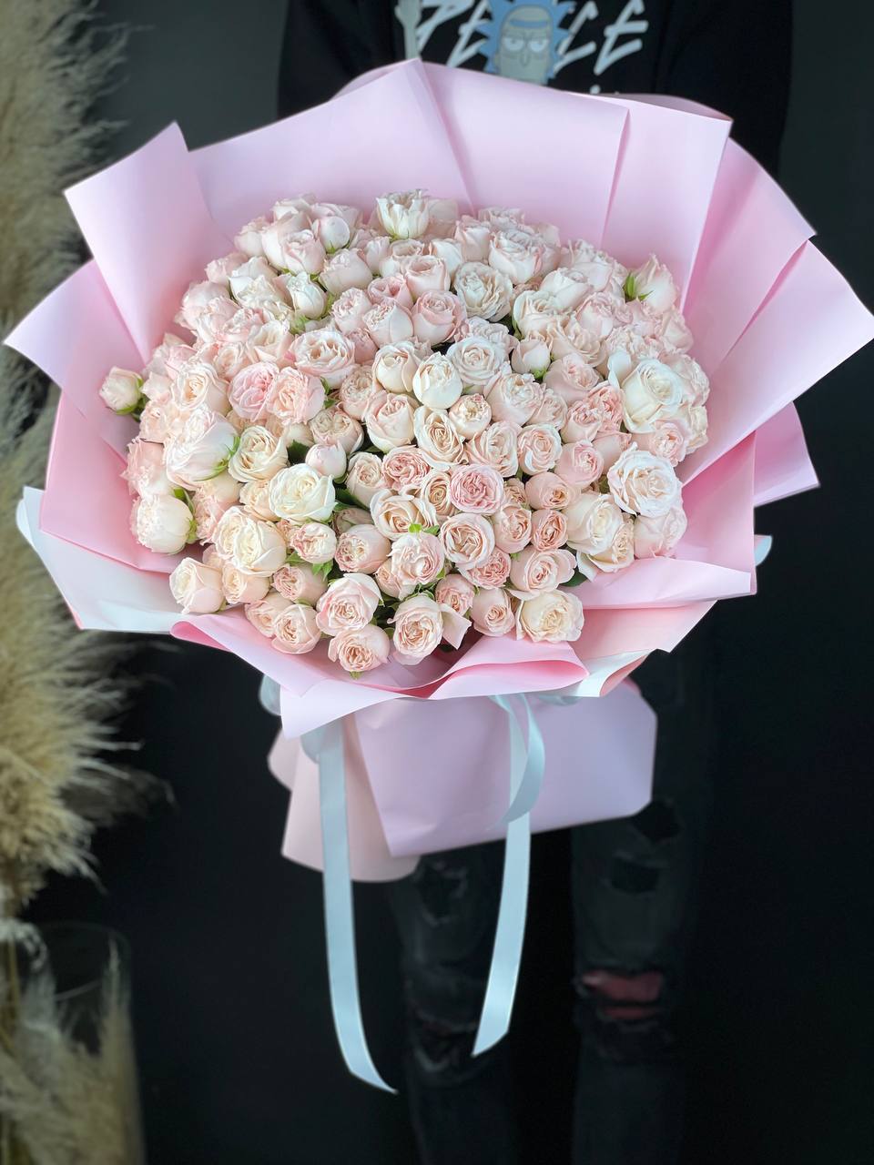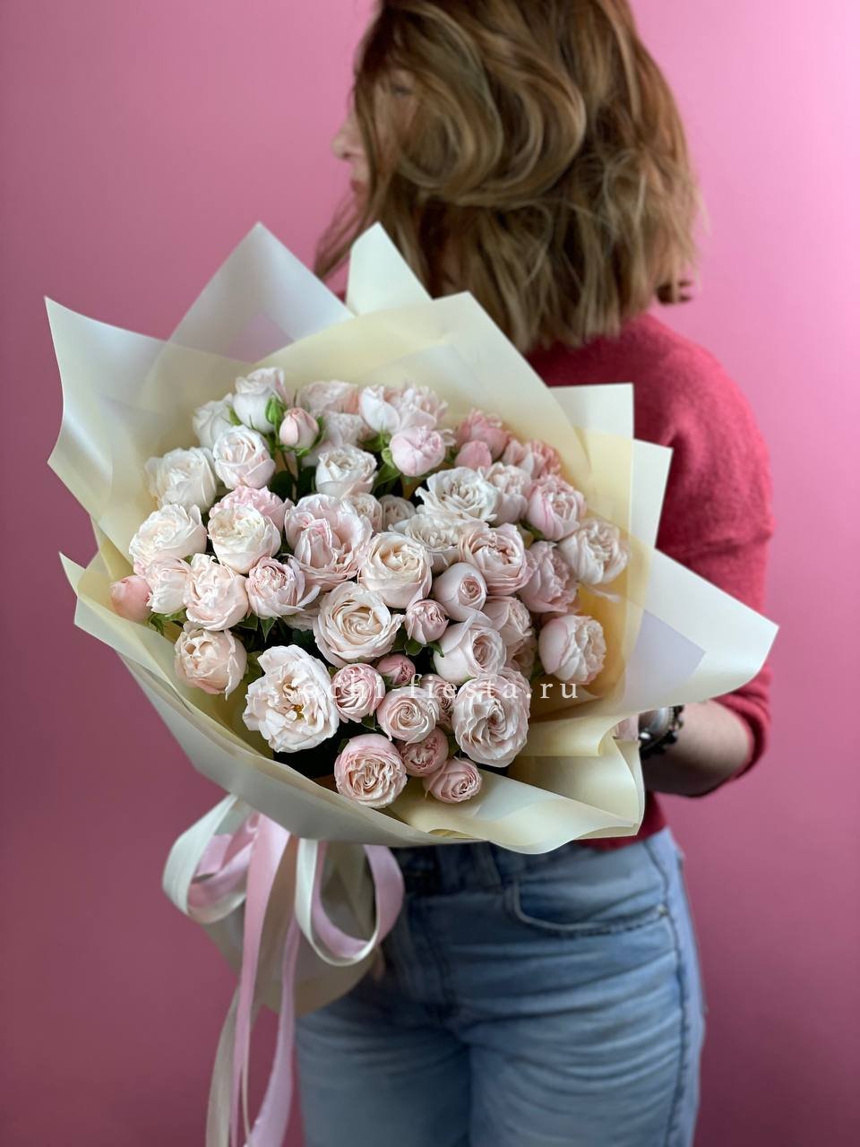 Свежий букет с множеством мелких бутонов образует воздушное облако. Кустовые розы собраны так, что композиция кажется легкой и подвижной, словно только что сорвана в саду.