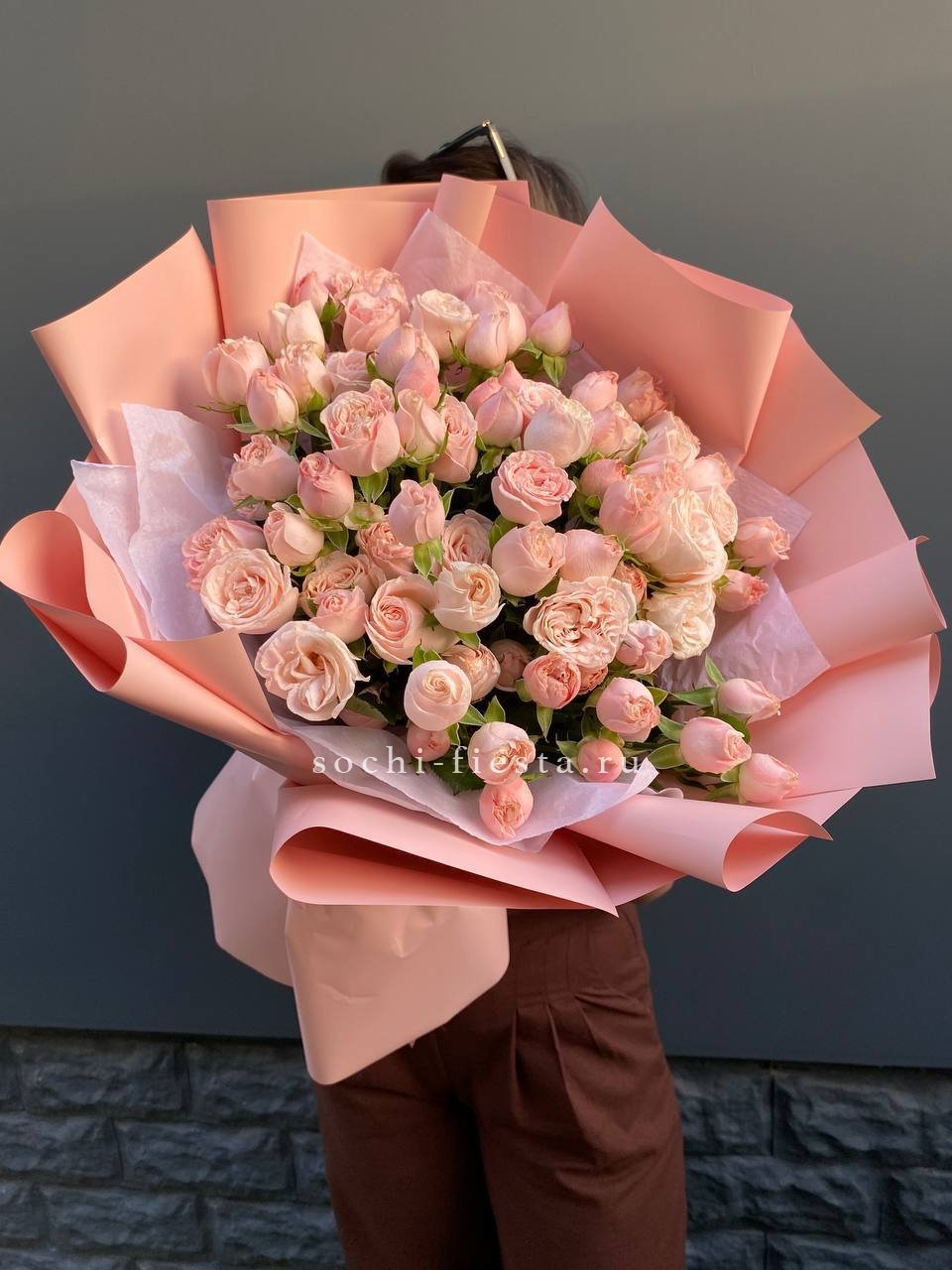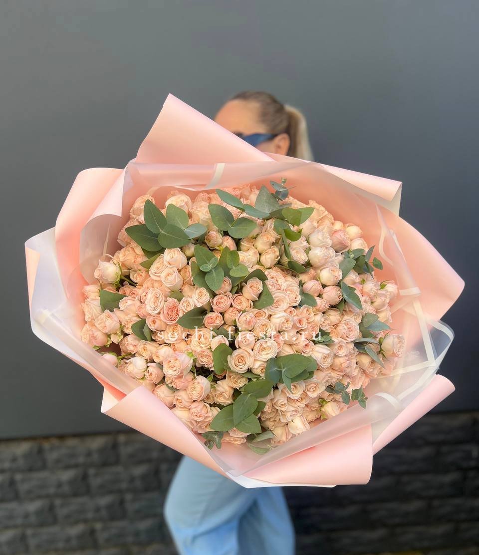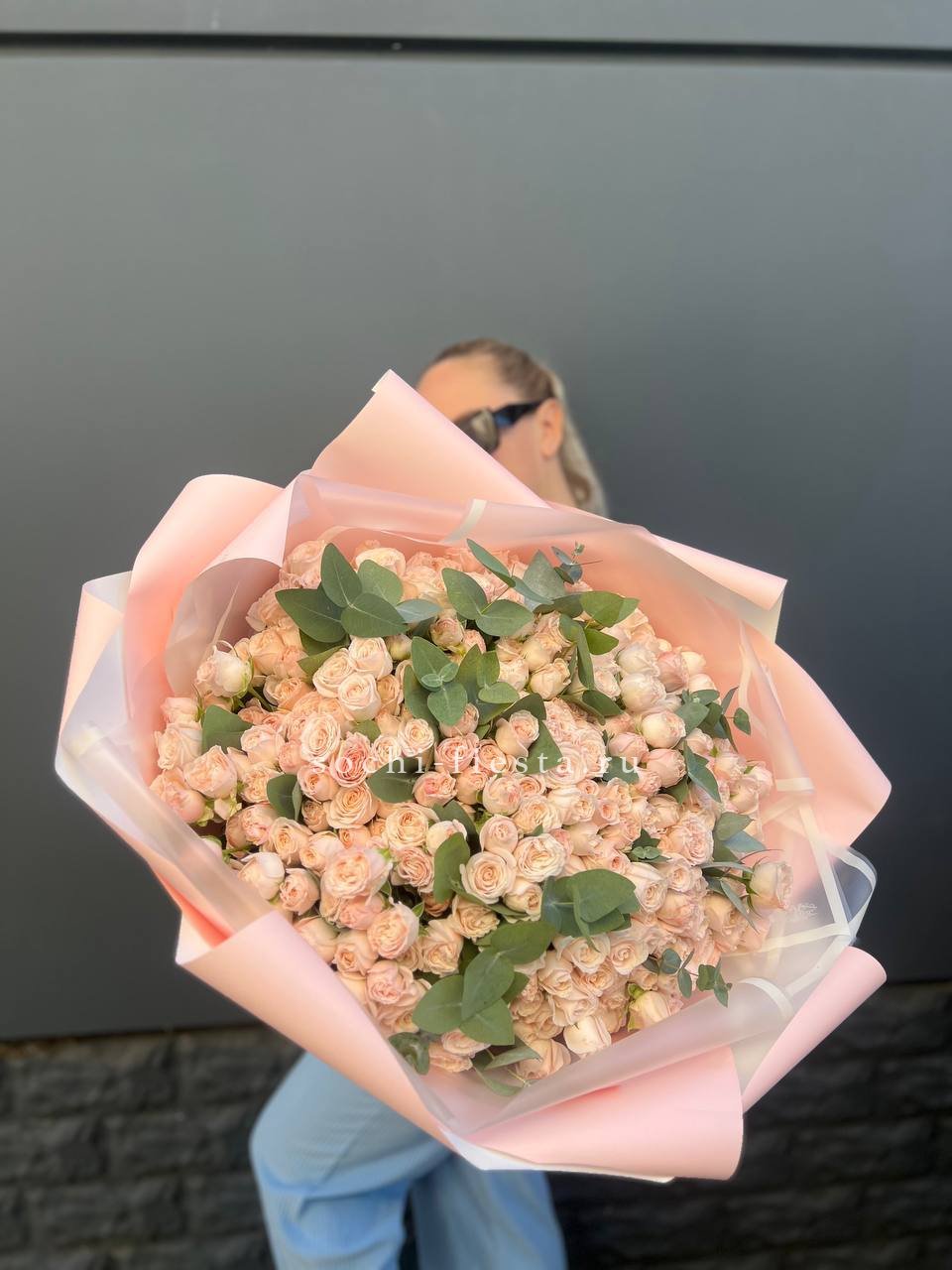 Тридцать пять пионовидных кустовых роз собраны в плетеной корзине и дополнены серебристым эвкалиптом. Округлые бутоны формируют объемную шапку светлых оттенков. Композиция легко размещается на столе и сохраняет форму.
