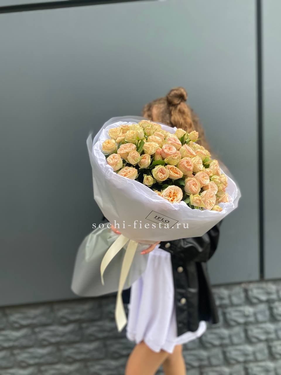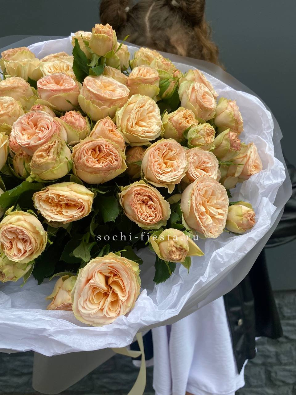 кустовая пионовидная роза, лента, дизайнерская упаковка.