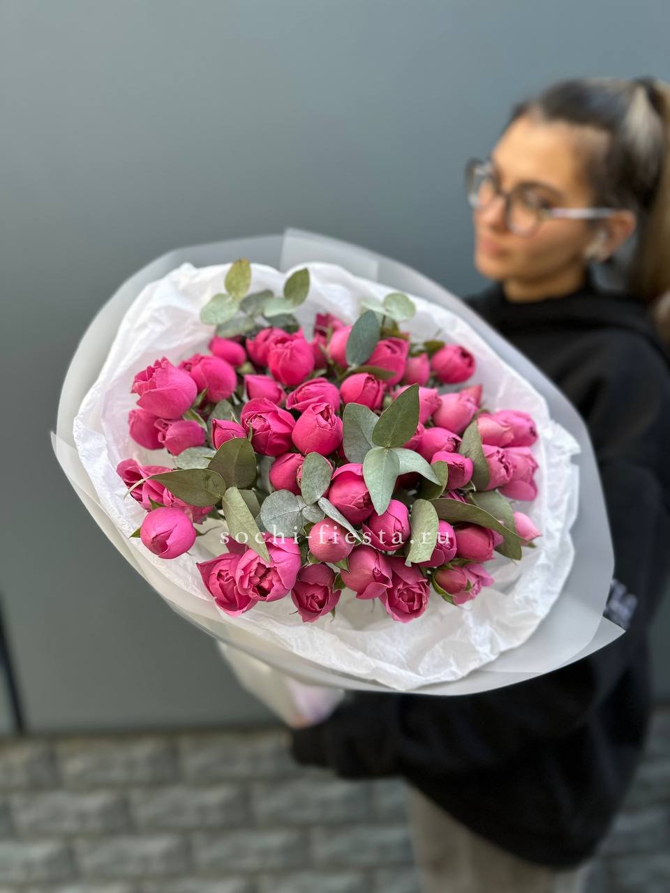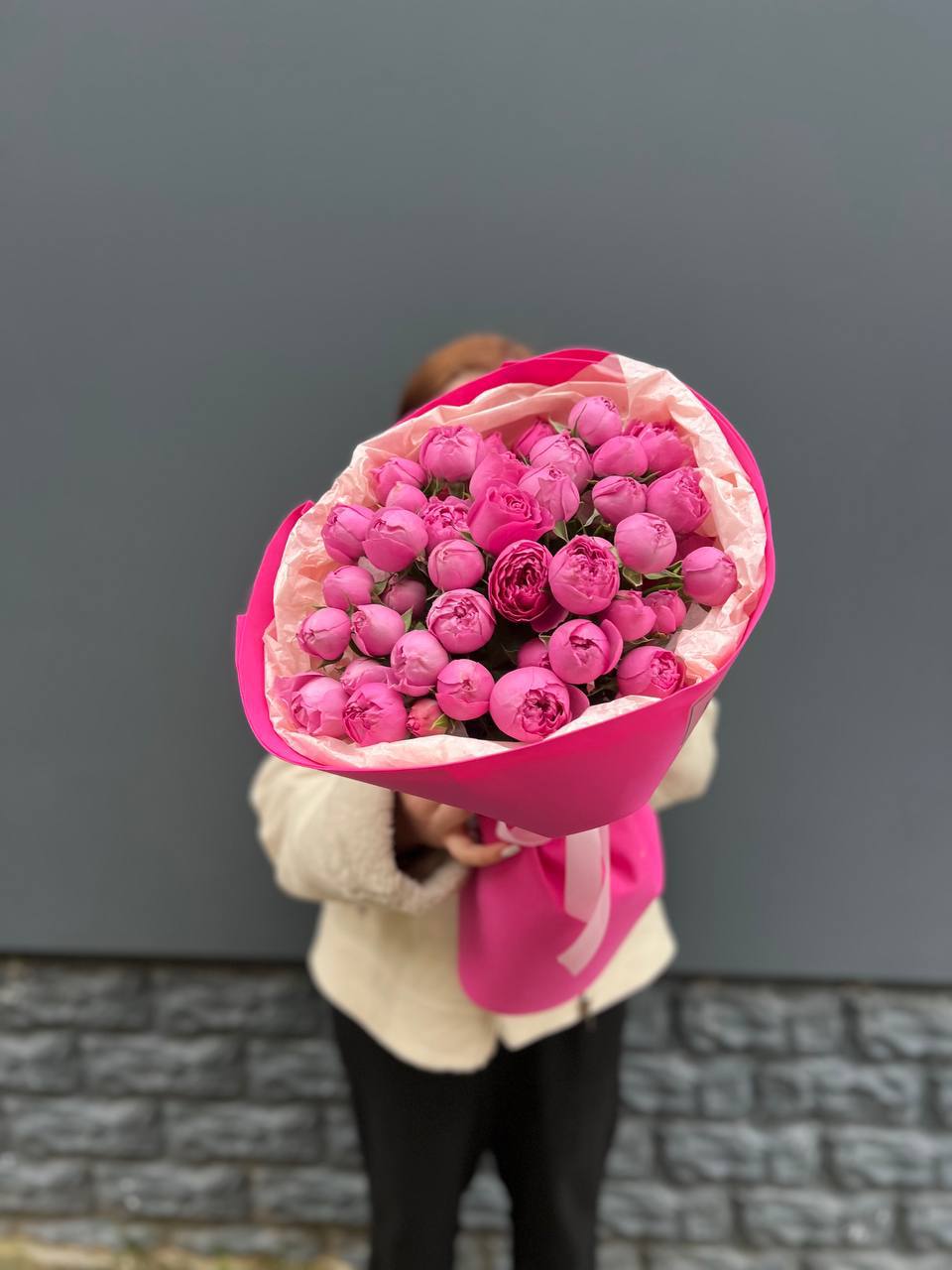 пионовидные розы кустовые мисти баблс в малиновом оформлении.