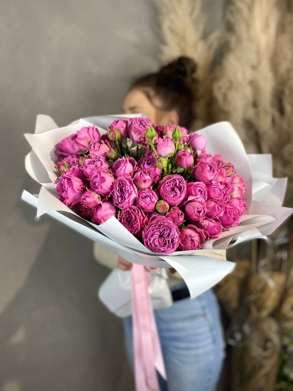 11 пионовидных кустовых роз розового оттенка, оформление.