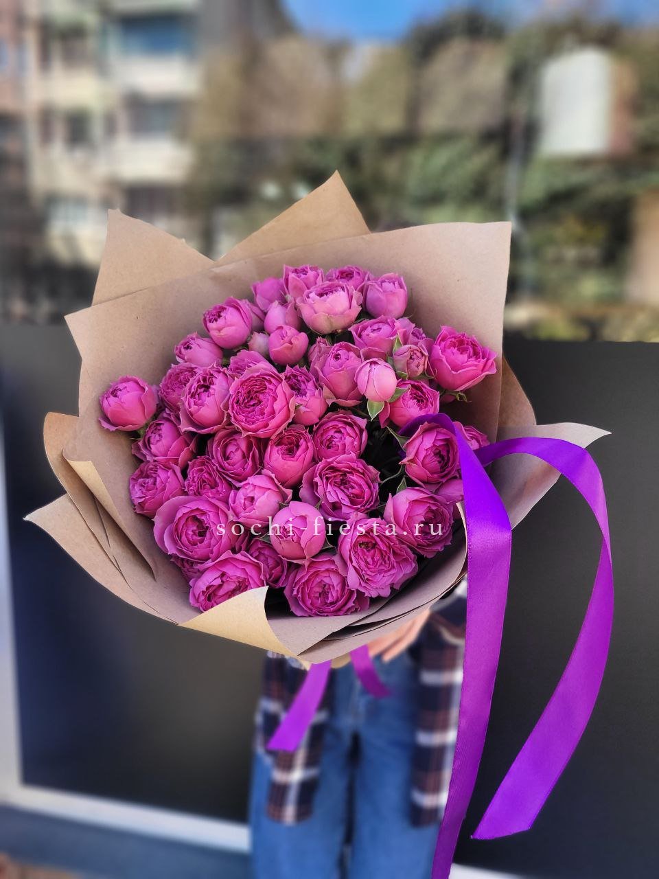 Многолепестковые головки кустовых роз с пионовидной структурой собраны в пышный букет розово-сиреневой гаммы. Крафтовая обёртка сохраняет естественность и подчёркивает густоту бутонов.