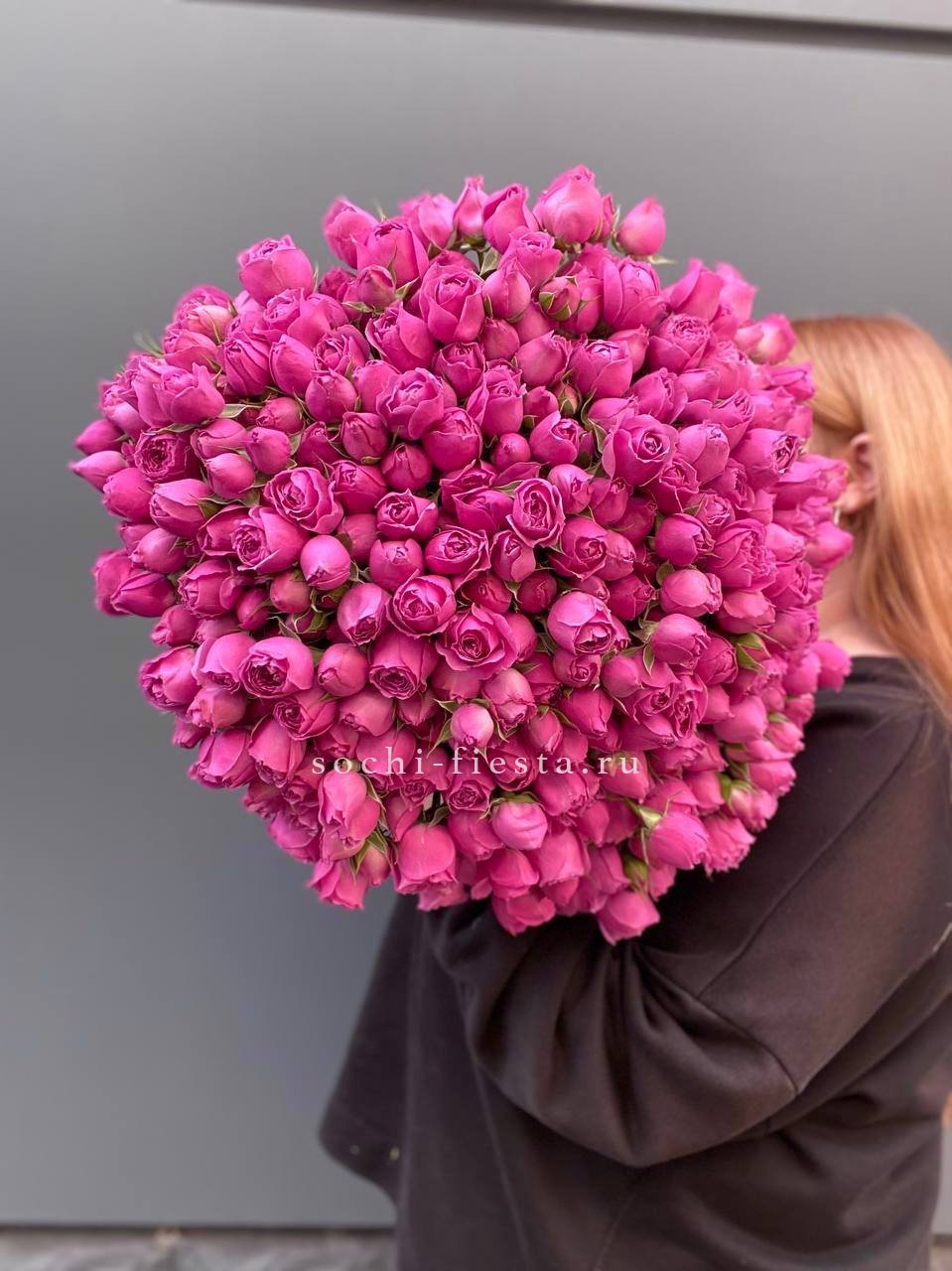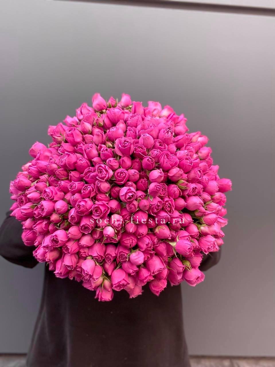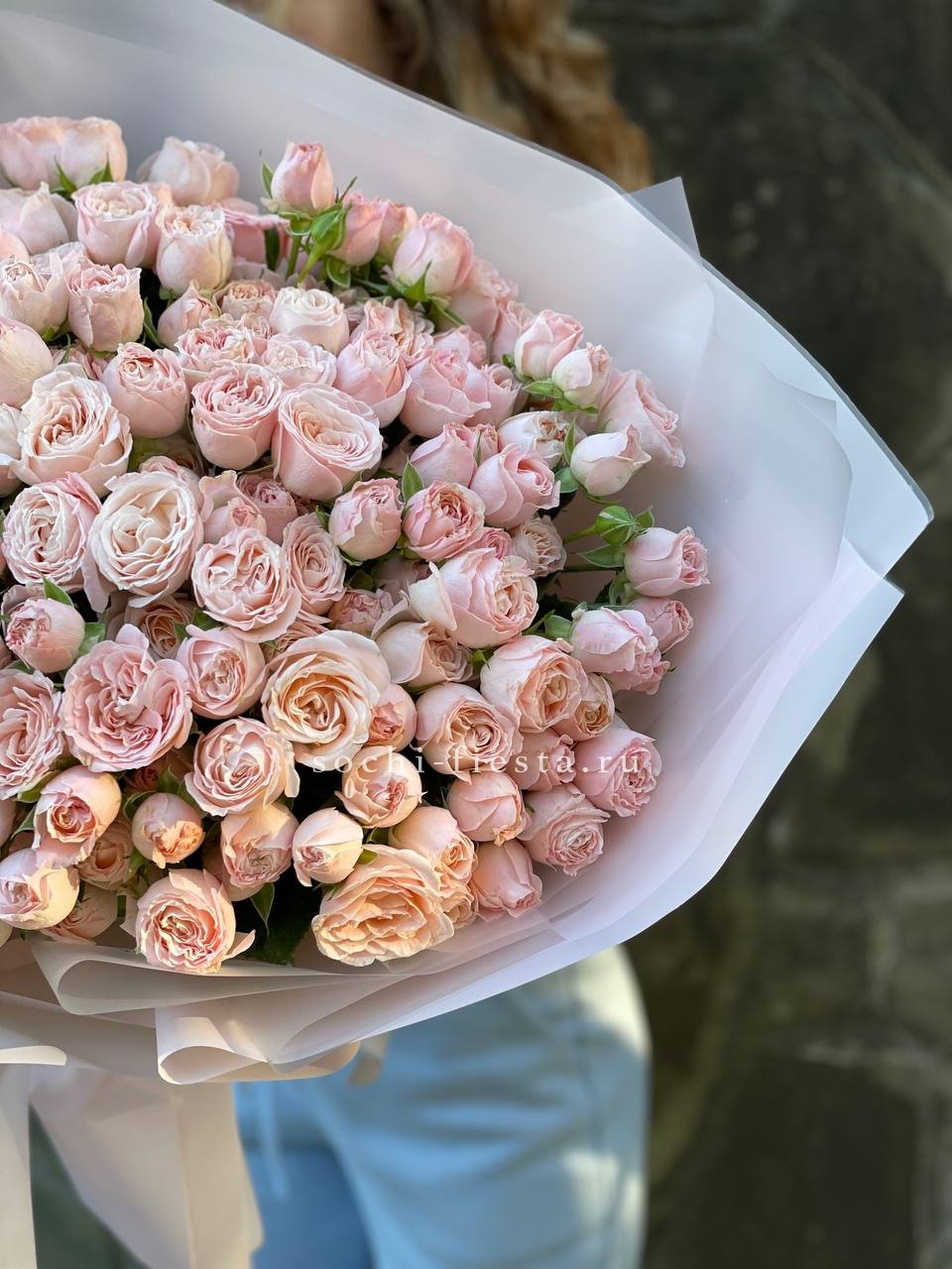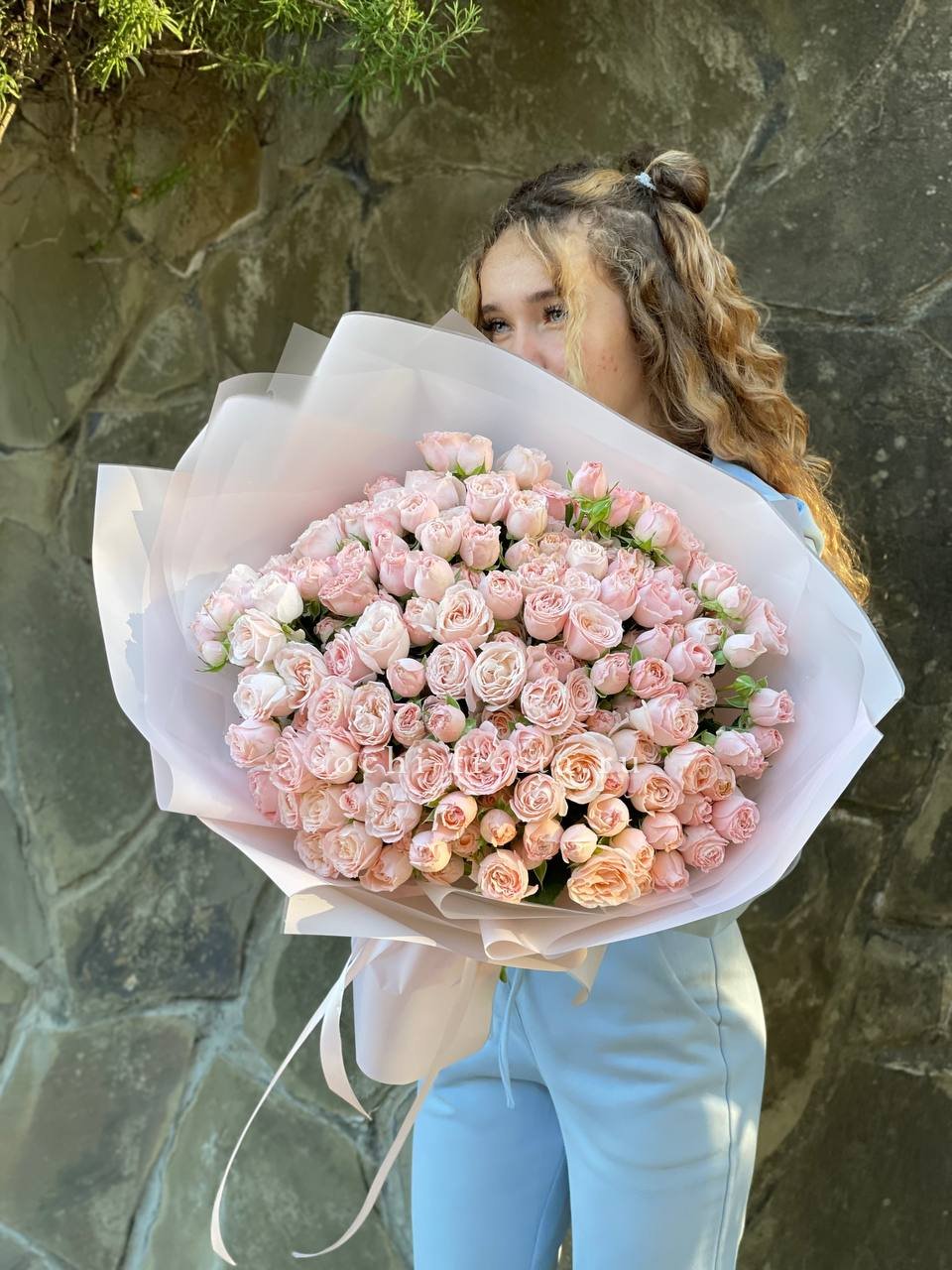 Девять кустовых роз собраны в компактную форму с мягким розовым оттенком. Множество небольших бутонов создают объемную текстуру и природную легкость. Букет упакован в матовую бумагу с лентой.