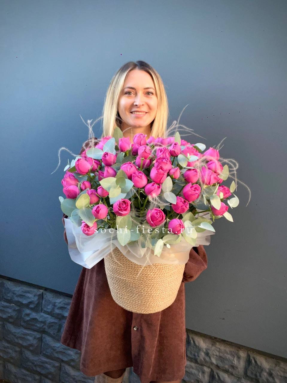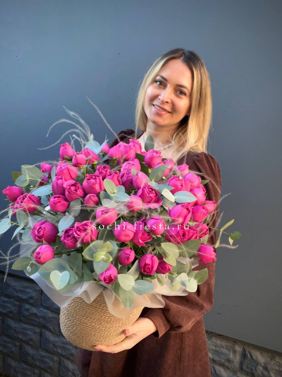 розы пионовидные 21шт, эвкалипт, пленка, лента.