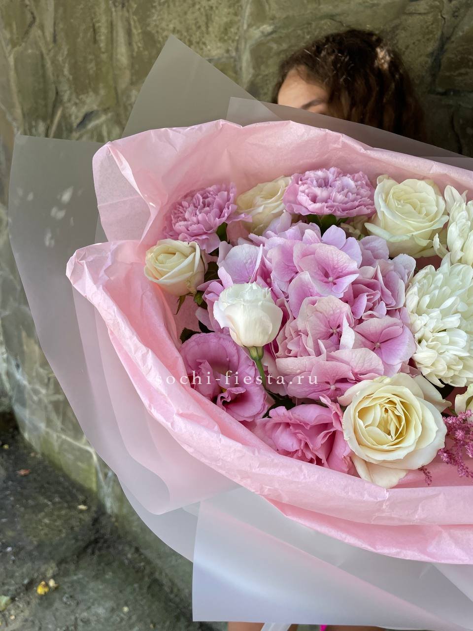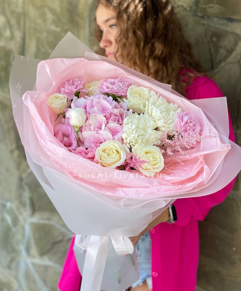 Пушистые шапки Мисти Бабблс переплетаются с классическими розовыми бутонами, создавая объёмный силуэт с мягкими переходами. Композиция собрана плотно, каждый цветок занимает своё место в общем ритме.