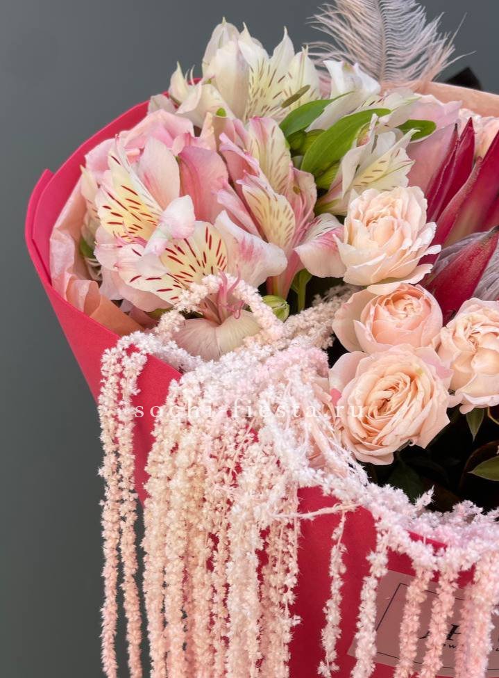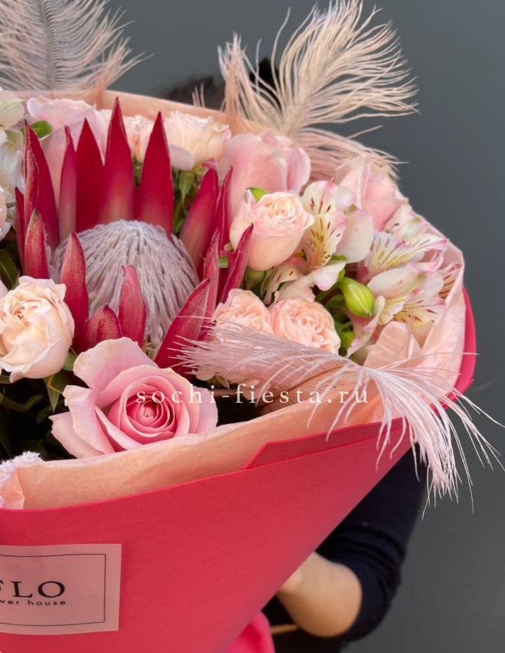 протея, кустовые розы, одноголовые розы, альстромерии, перья, амарант, лента и дизайнерская пленка.