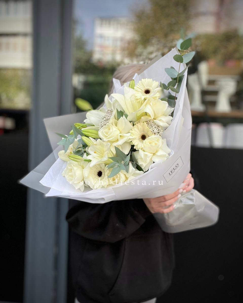 гербера, роза, лилия, озатамус, эвкалипт, упаковка.