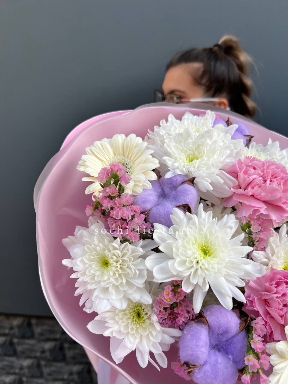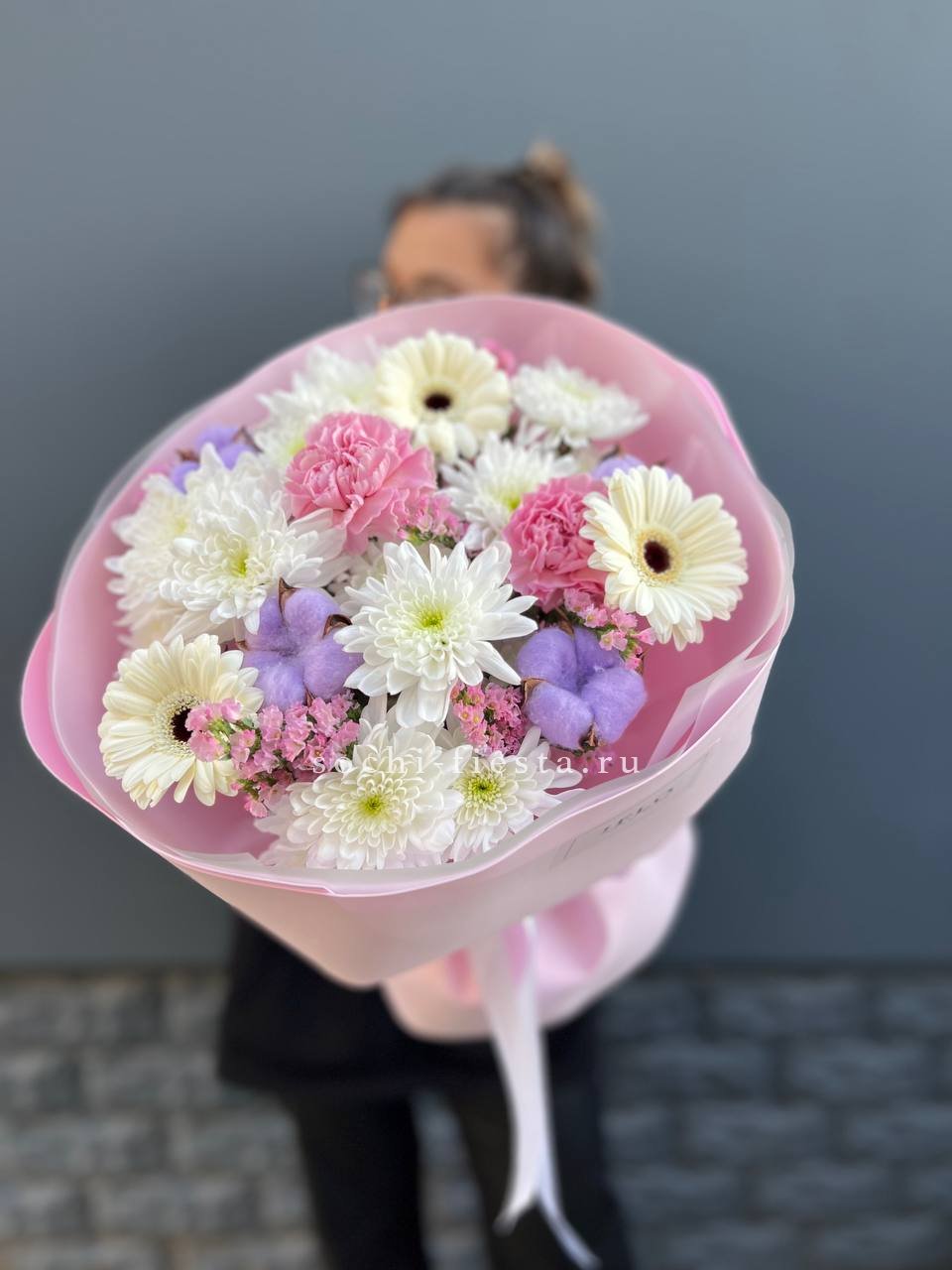 Пастельная гамма с лёгким касанием зимнего воздуха. Кустовые розы и диантус окружены воздушным ковылём, создавая мягкую текстуру с едва уловимой графикой. Гортензия добавляет объём, не перегружая силуэт.