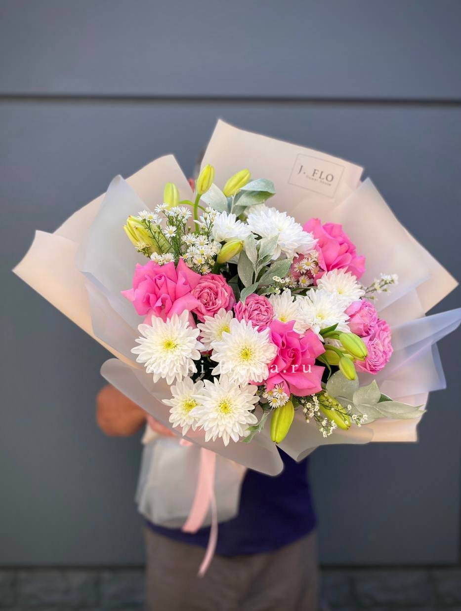 Сочетание лилий и роз разных форм с кустовыми хризантемами и ромашками создаёт многослойную композицию. Carlo объединяет садовую свежесть и классическую гармонию в одном букете.
