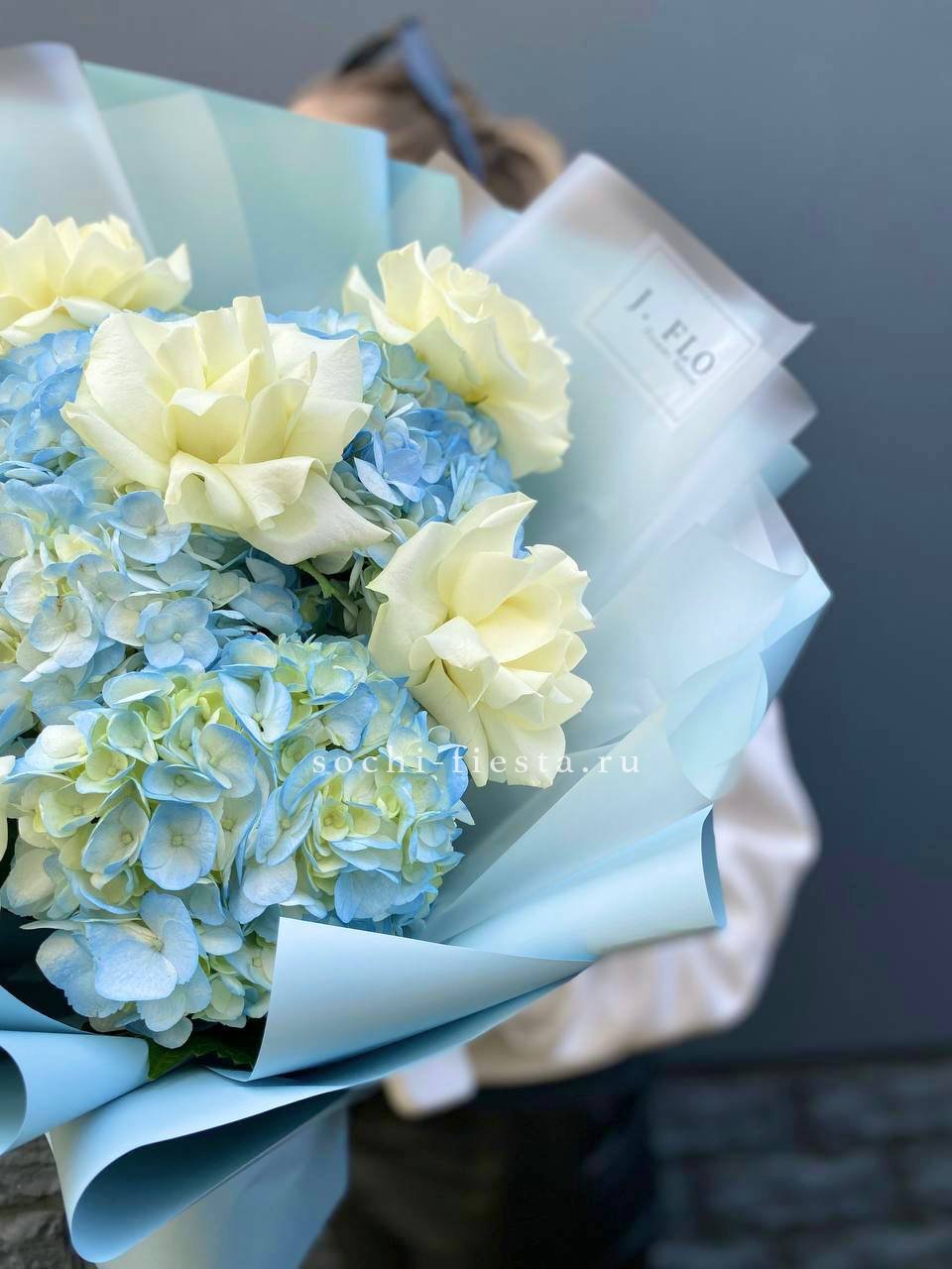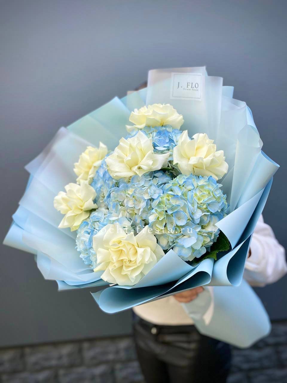белые французские розы, гортензия, маттиола, хлопок, ковыль (стифа), пионовидные розы, авторское оформление.