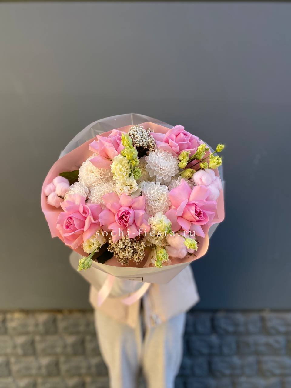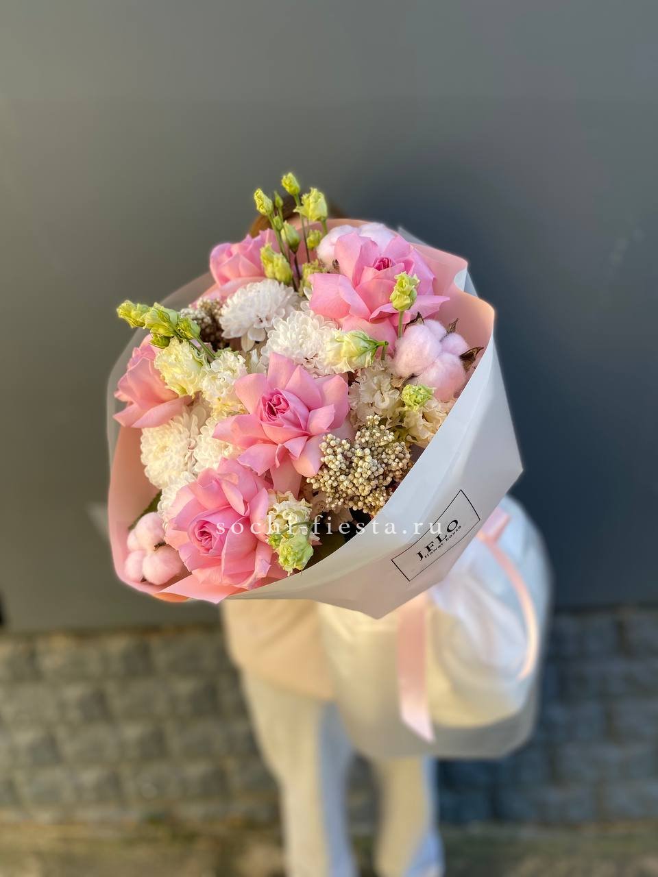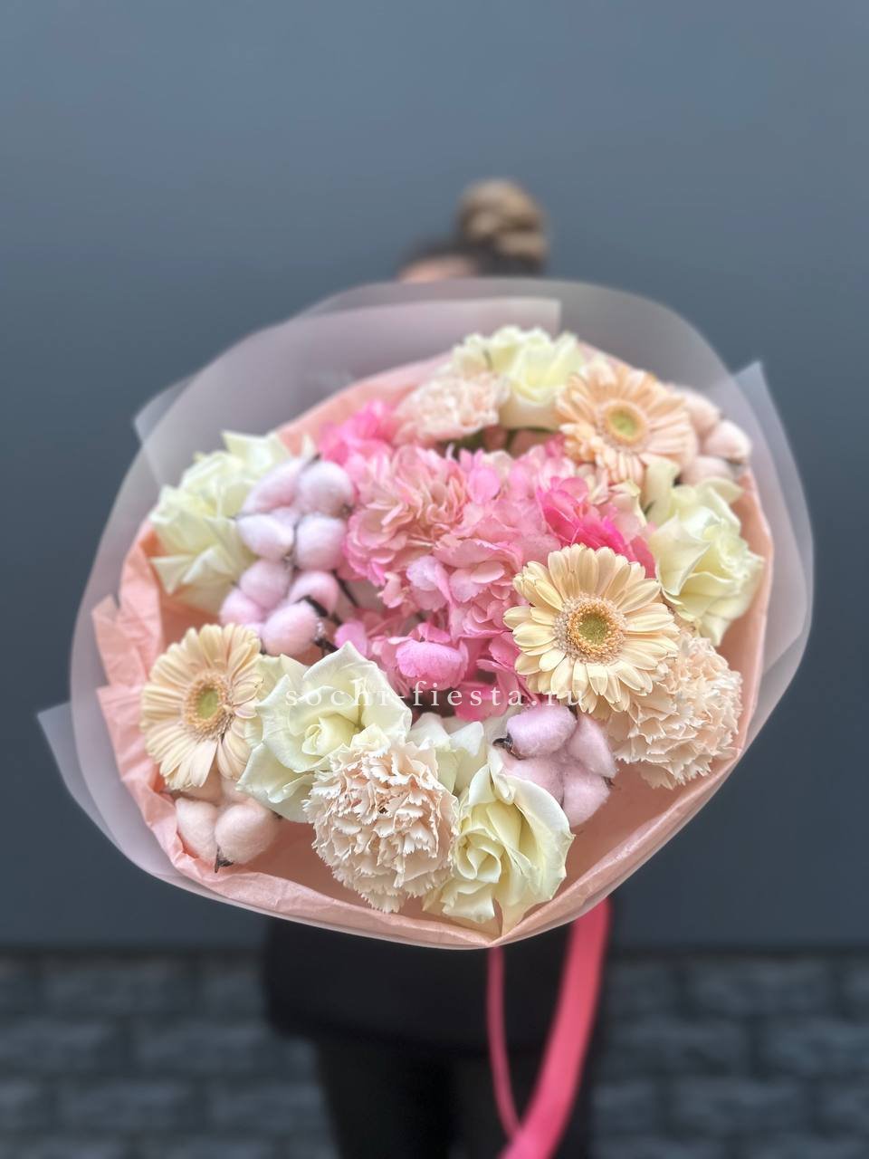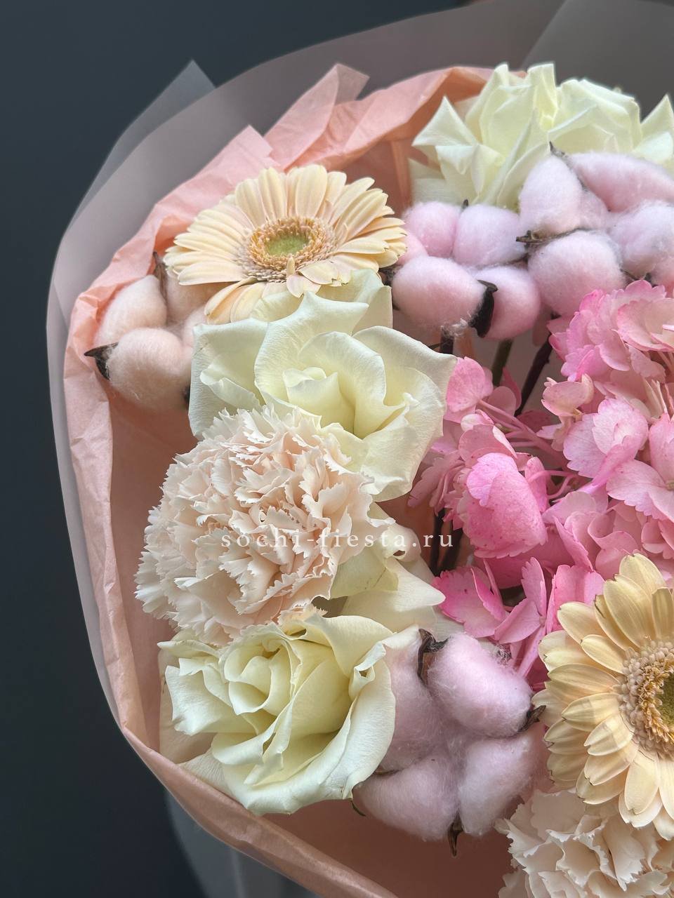 Белые французские розы переплетаются с пушистыми соцветиями маттиолы и хлопка. Гортензия и пионовидные бутоны создают объём, а ковыль вносит лёгкую небрежность в общий ритм.