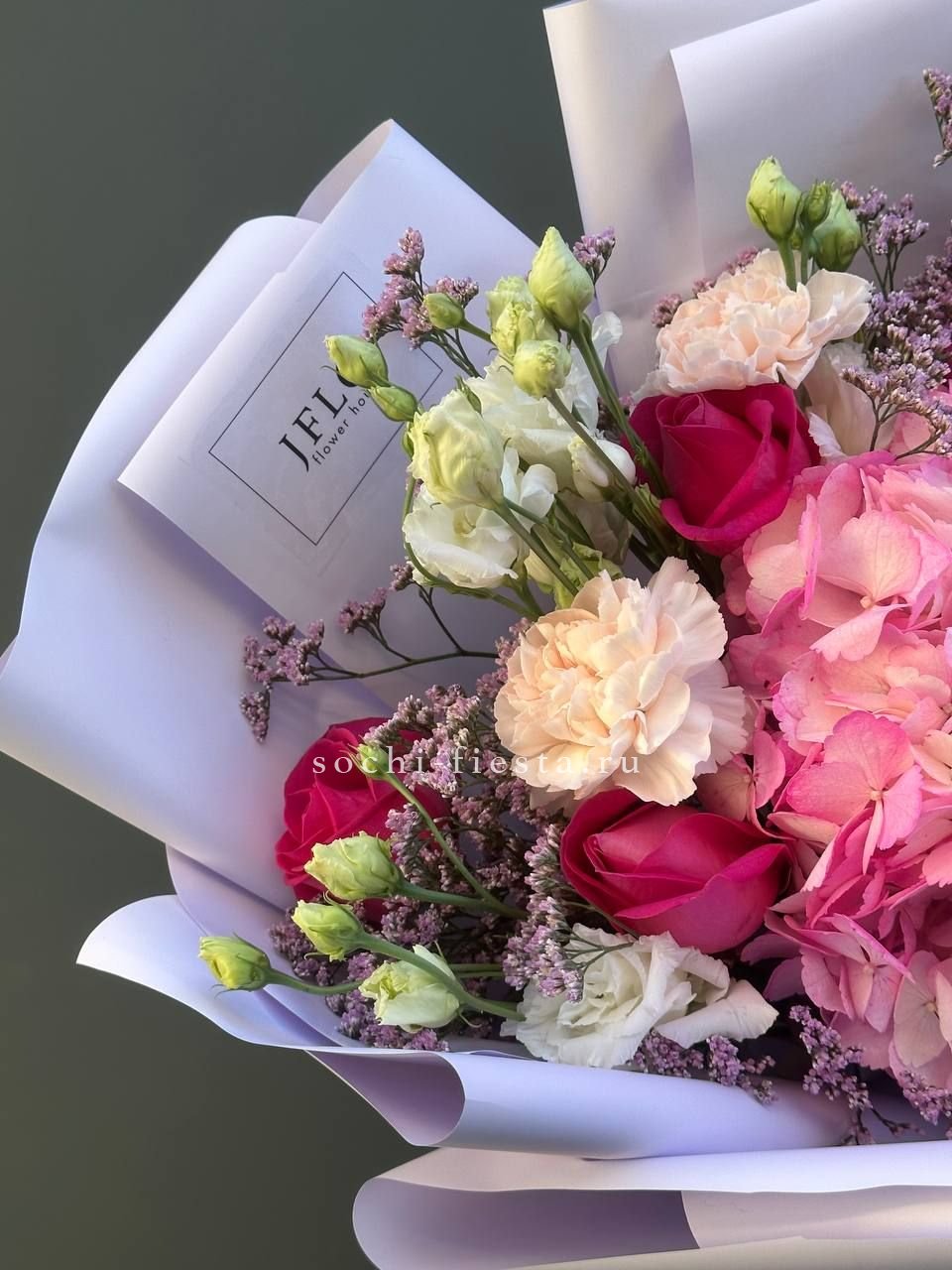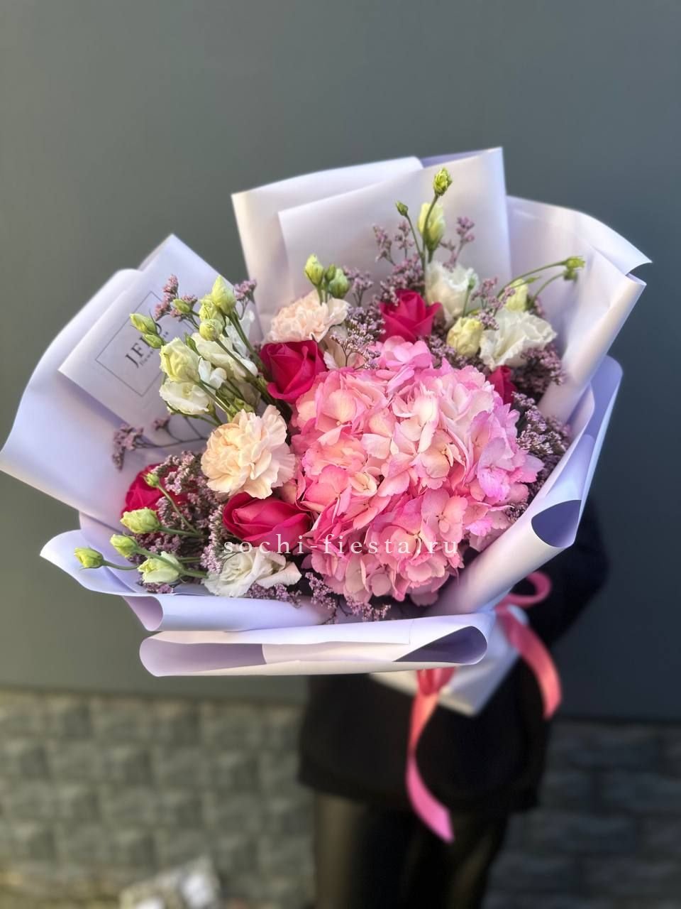 французские розы, маттиола, гортензии, эвкалипт, стифа, упаковка, лента.