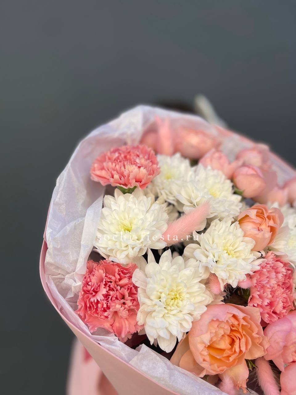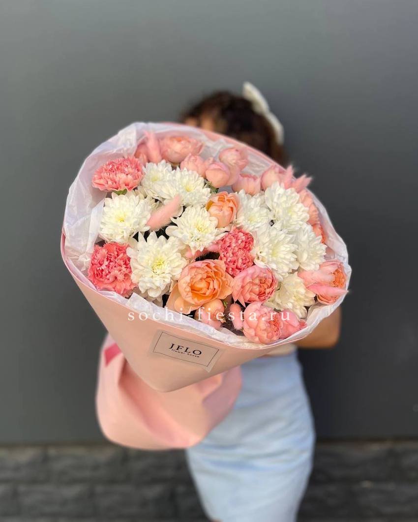 Состав букета: роза кустовая, хризантемы, озотамнус, диантус,  матрикария, упаковка, лента.