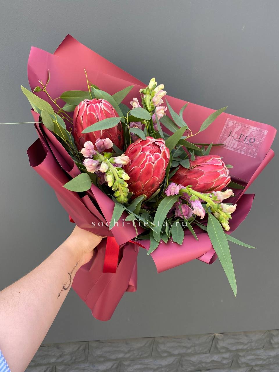 протея, декоративная зелень в зависимости от сезона, антиринум, дизайнерская упаковка.