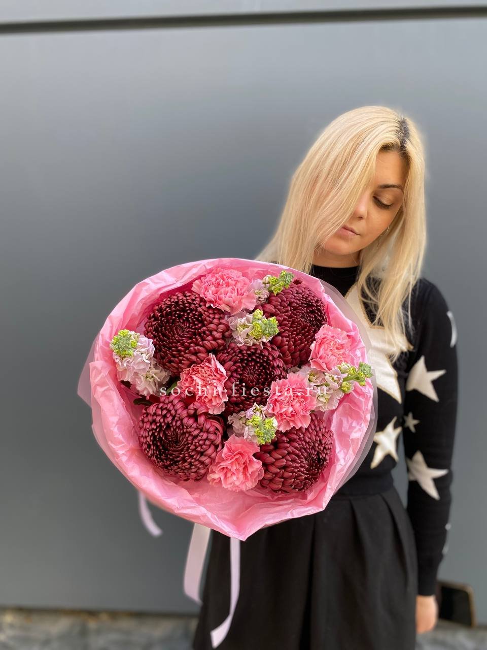 Воздушная композиция с пышными головками маттиолы и яркими диантусами создаёт лёгкое весеннее настроение. Каждый бутон раскрывается по-своему, добавляя объём и живую динамику всему букету.