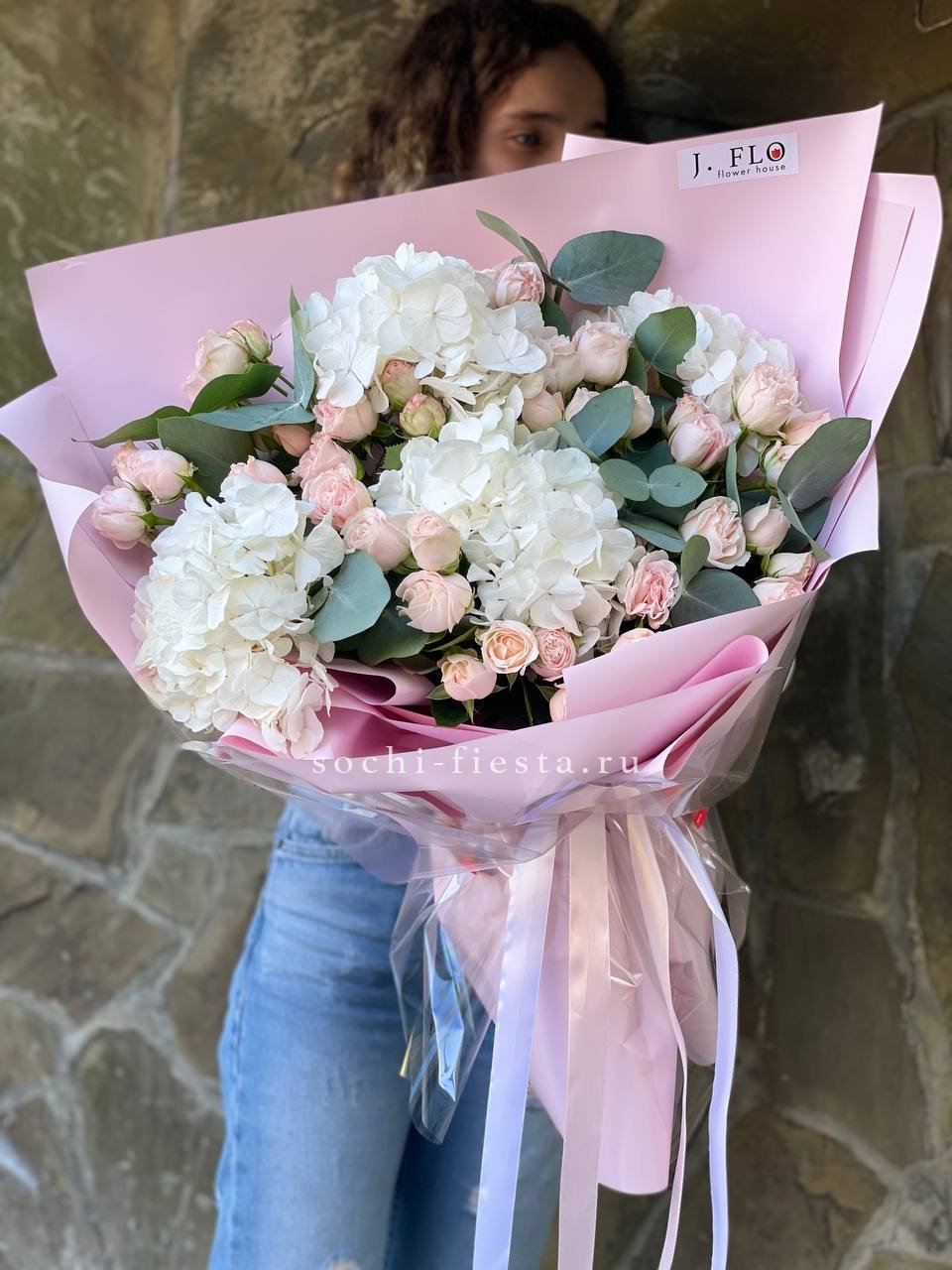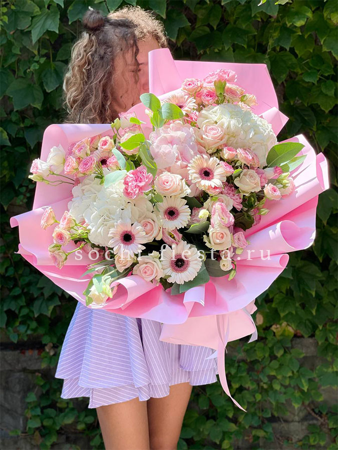 хризантема, гортензия, розовая роза, эустома, пионы ( может меняться, в зависимости от сезона), бомбастик, диантус, лента.