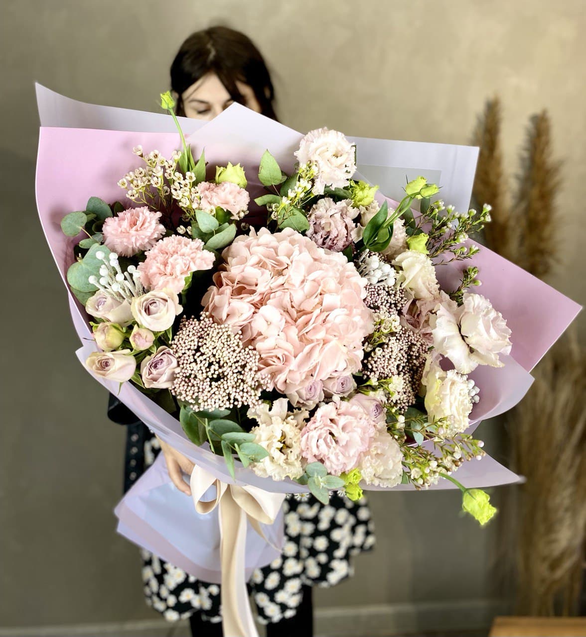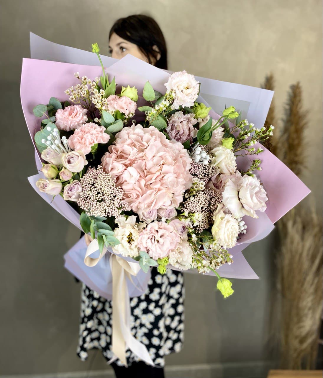 Пышная шапка из гортензии и пионовидных роз собрана с филигранной точностью. Диантус и эустома создают воздушные переходы между крупными соцветиями, а озотамнус добавляет графичные вертикали. Букет для тех, кто понимает язык авторской флористики.