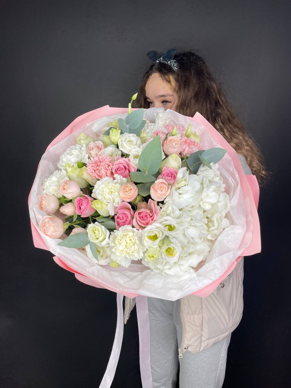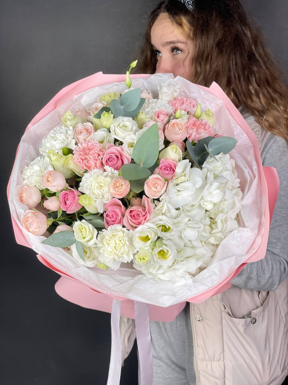 гортензия, пионовидные розы, пампасная трава (стифа), лента, дизайнерская упаковка.